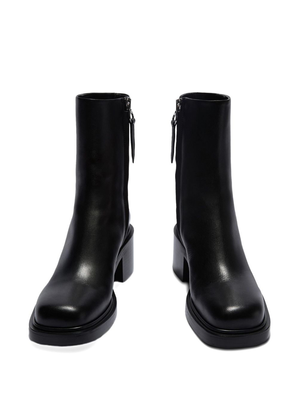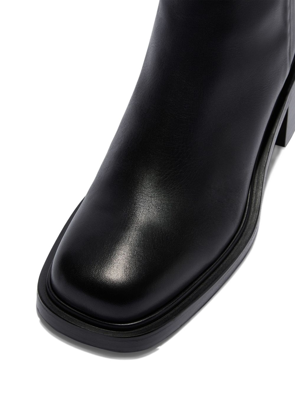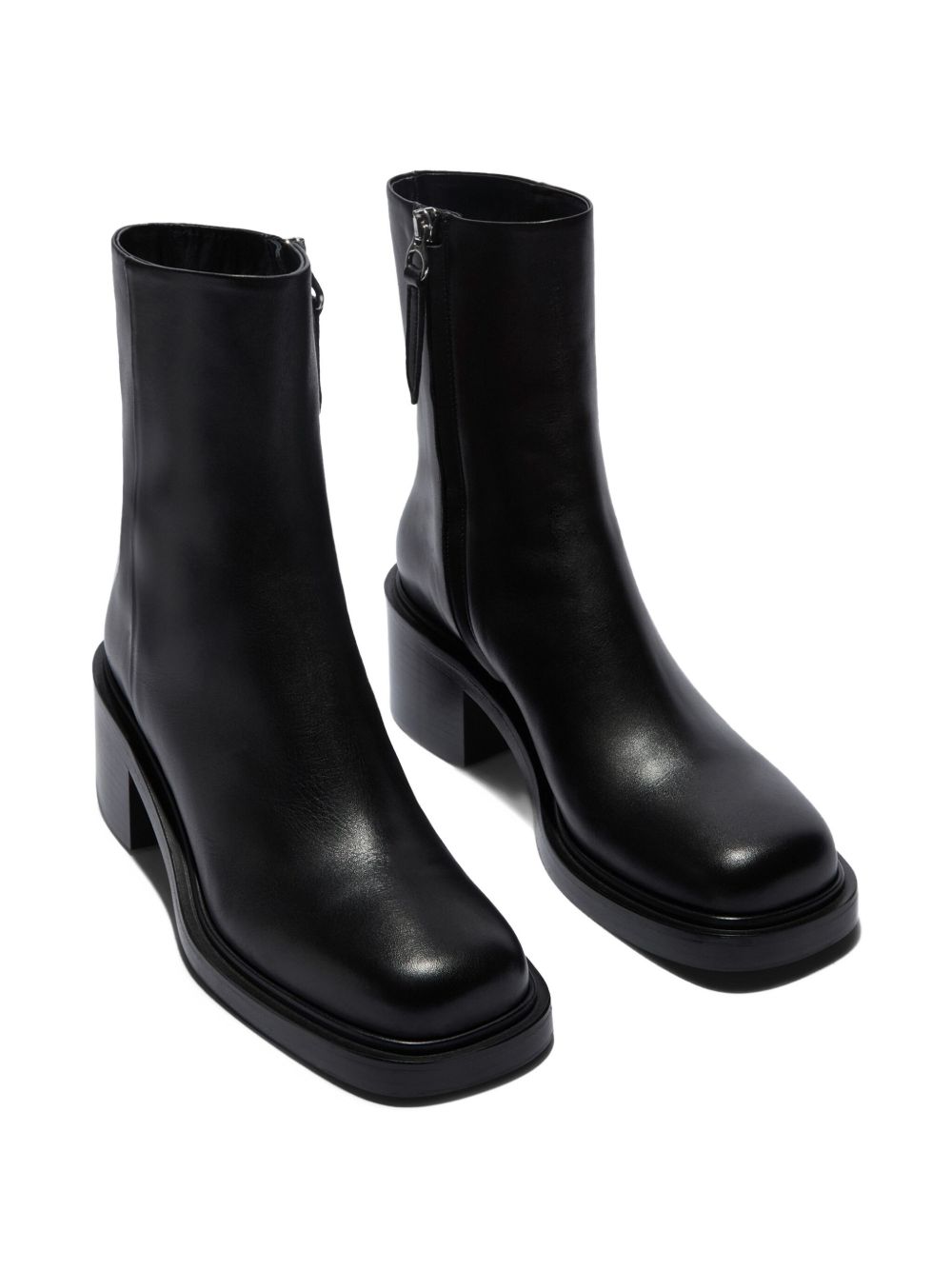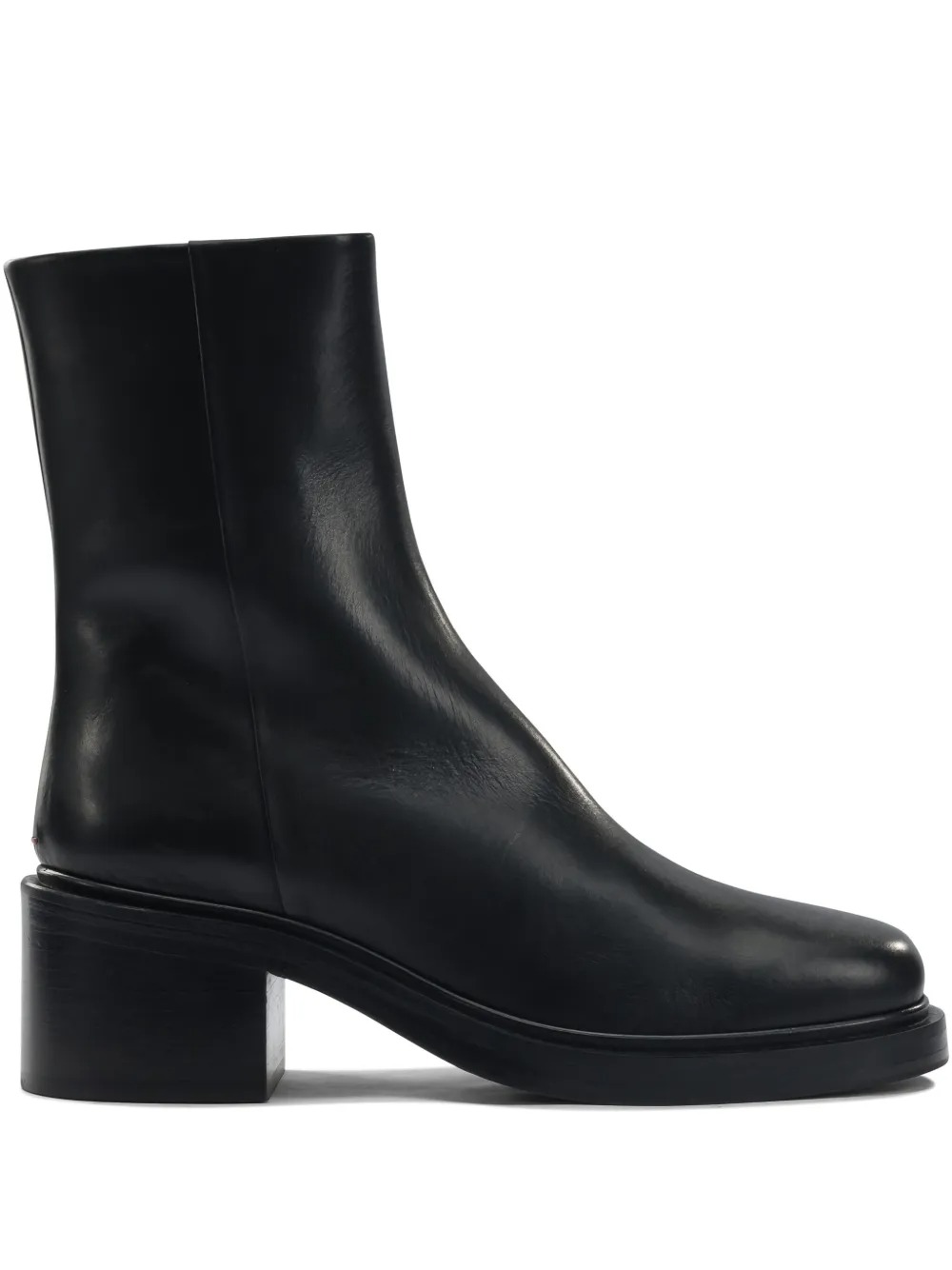 Black Teddy boots by Aeyde in leather with pointed toe, low block heel, side zip closure, ankle height.