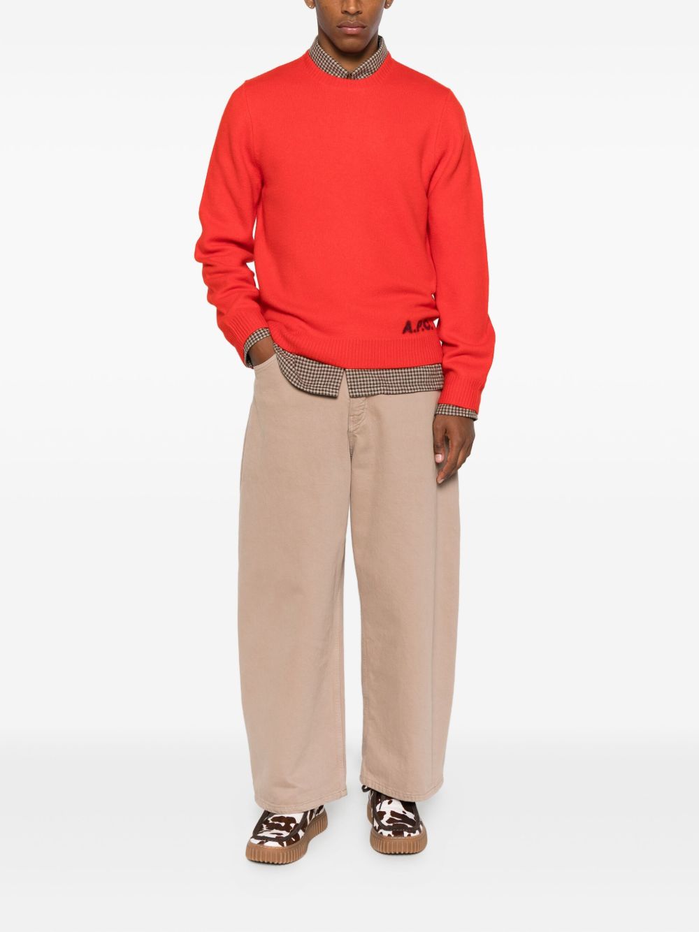 Coral red Erdward sweater by A.P.C. in wool with a crew neck, long sleeves, jacquard pattern with logo, and straight hem.