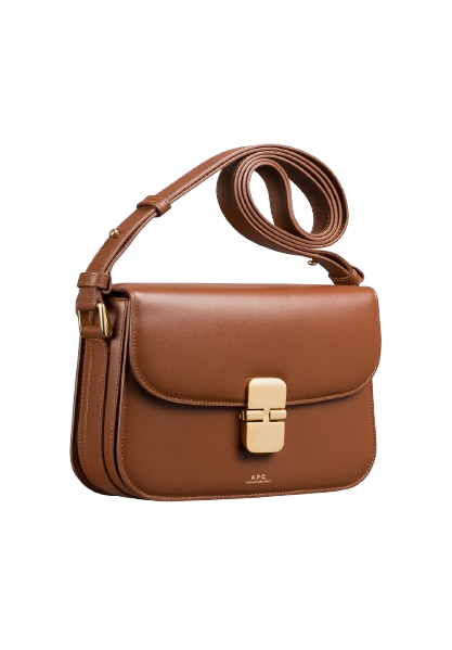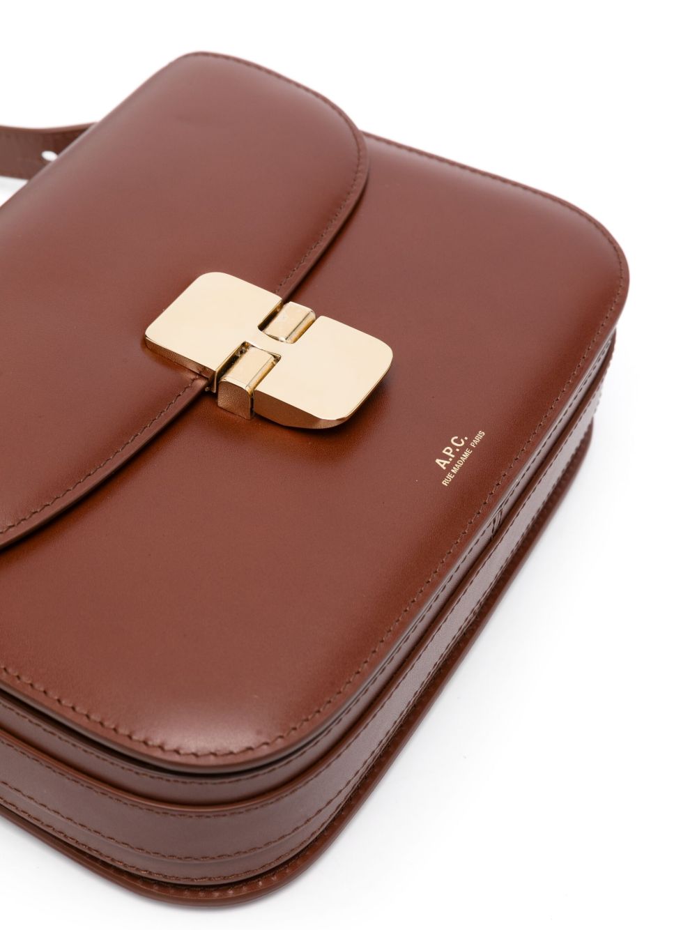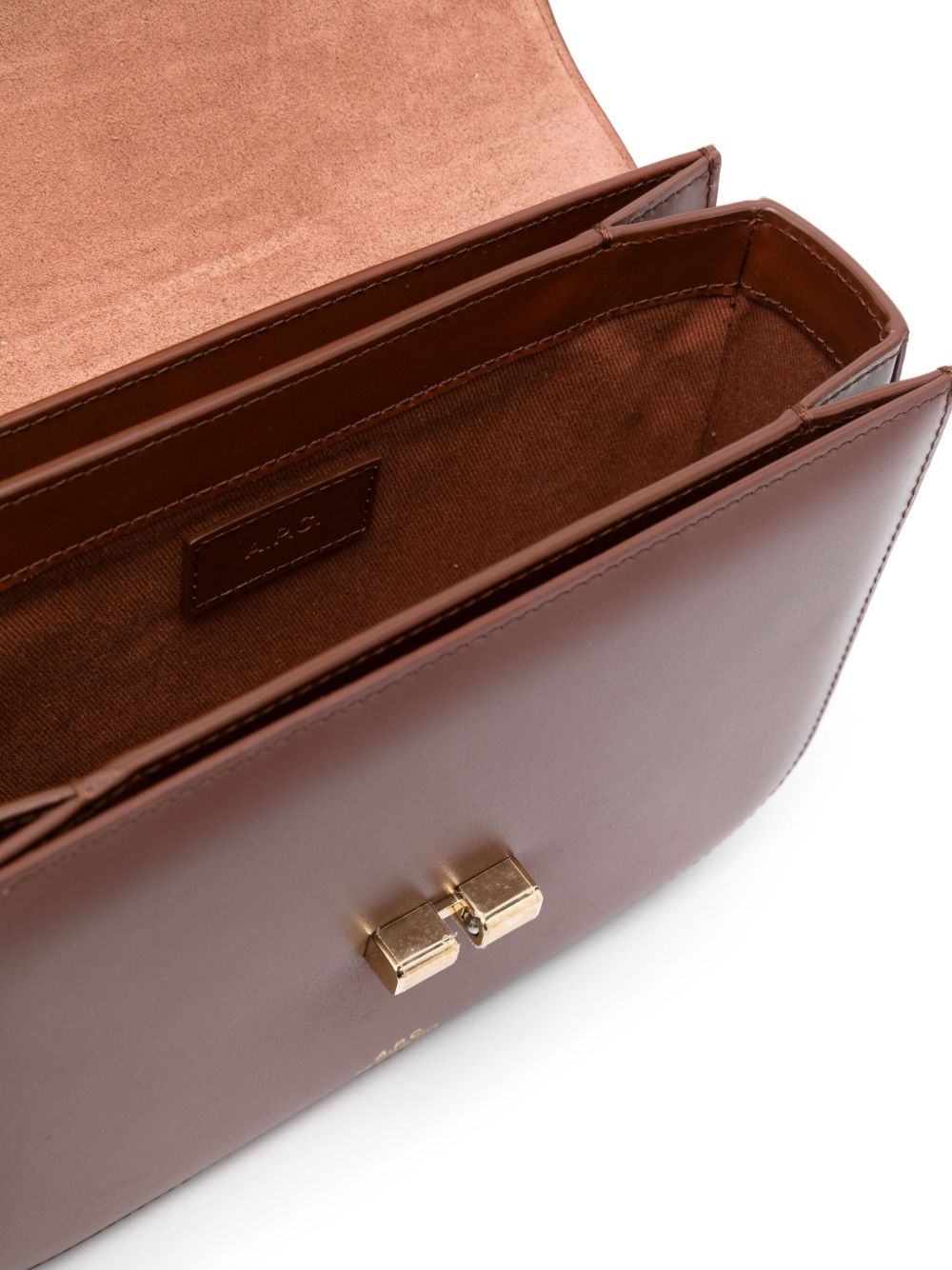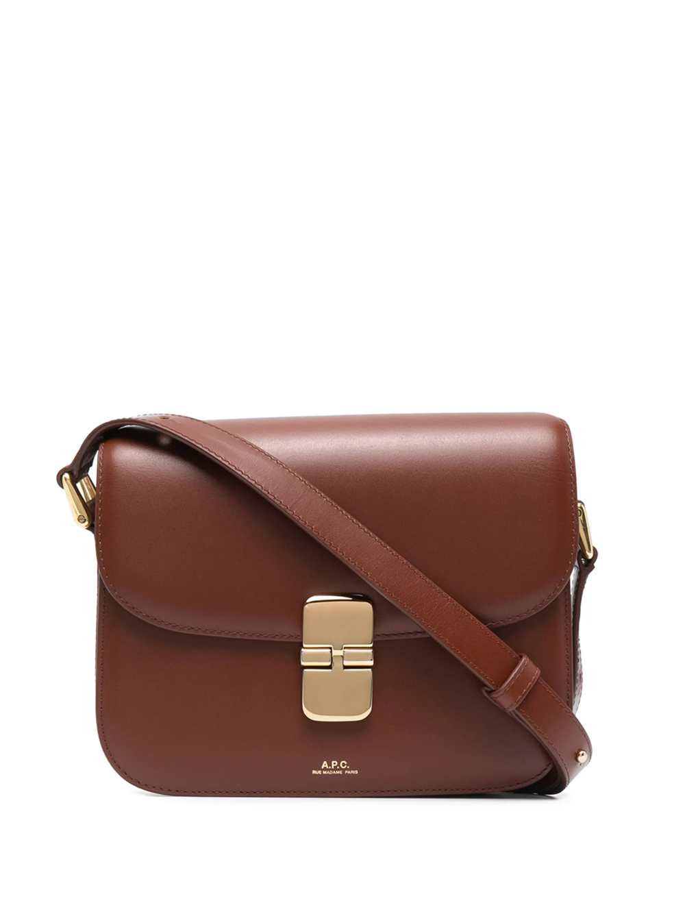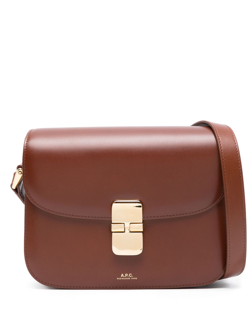 Marrone Grace Small bag by A.P.C. in pelle whit gold-tone metal closure flap, gold-tone printed logo, adjustable shoulder strap and interior compartment.