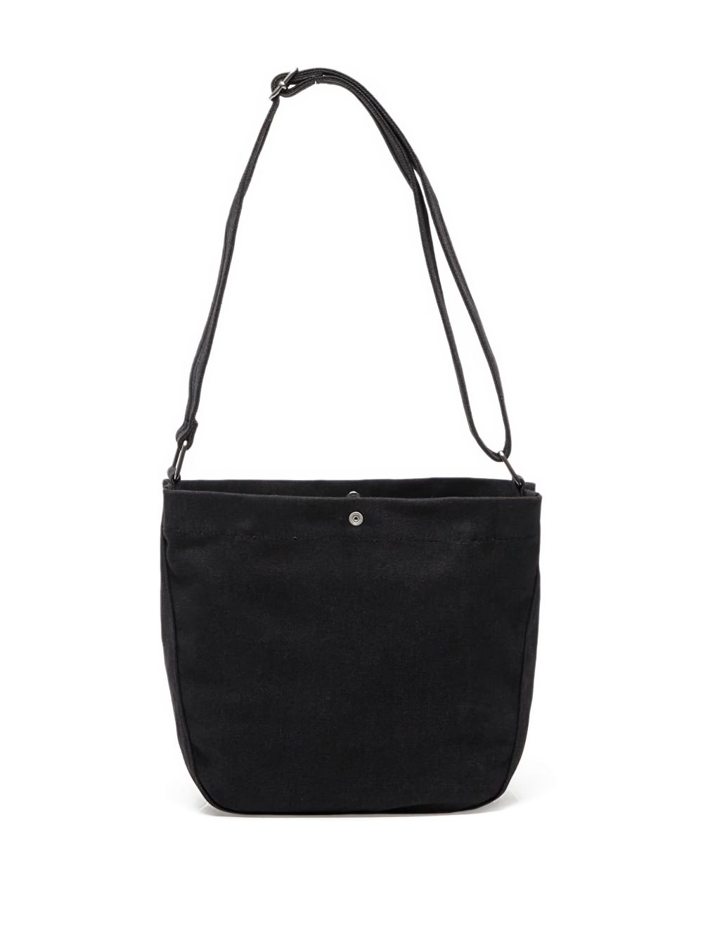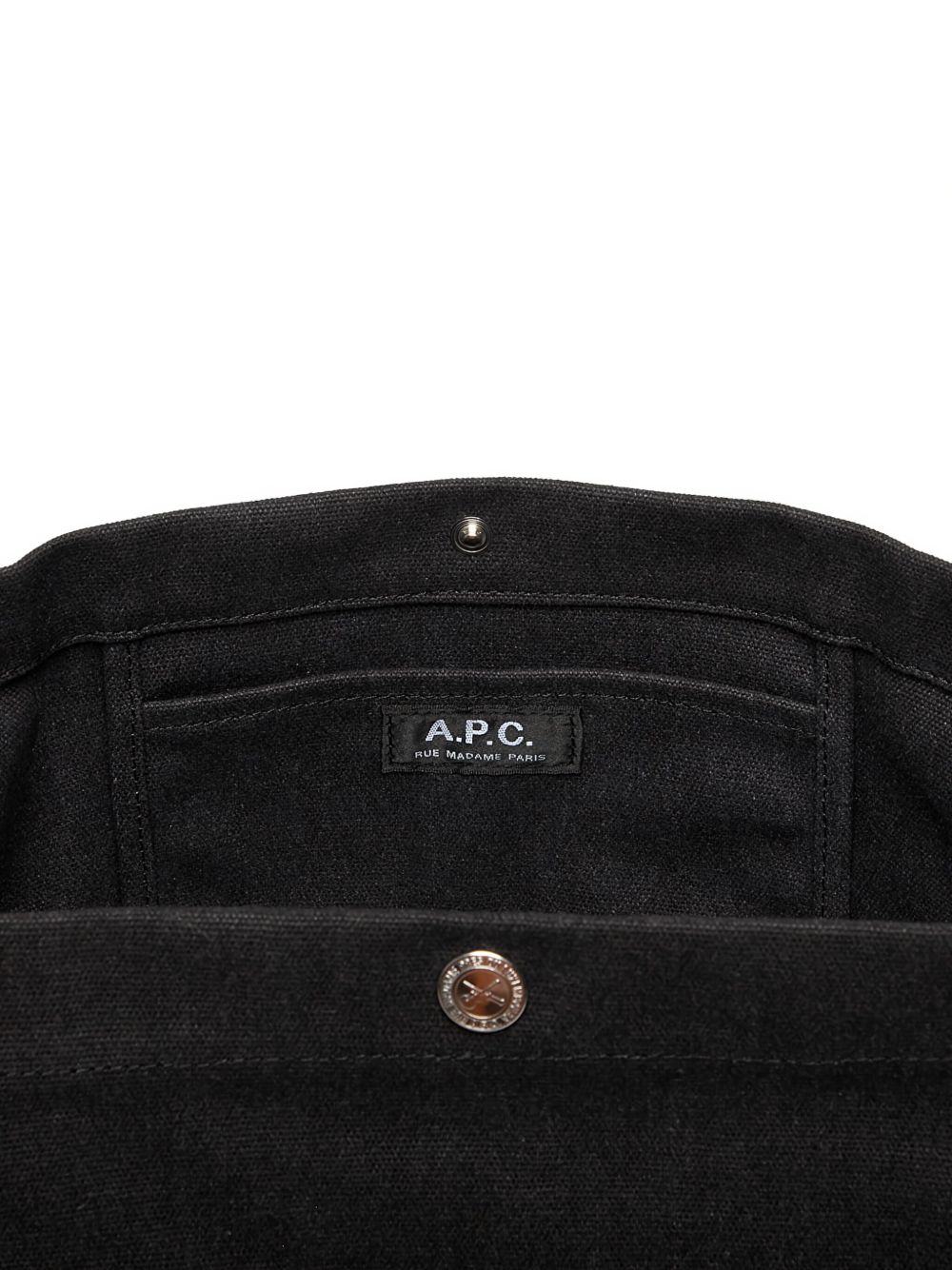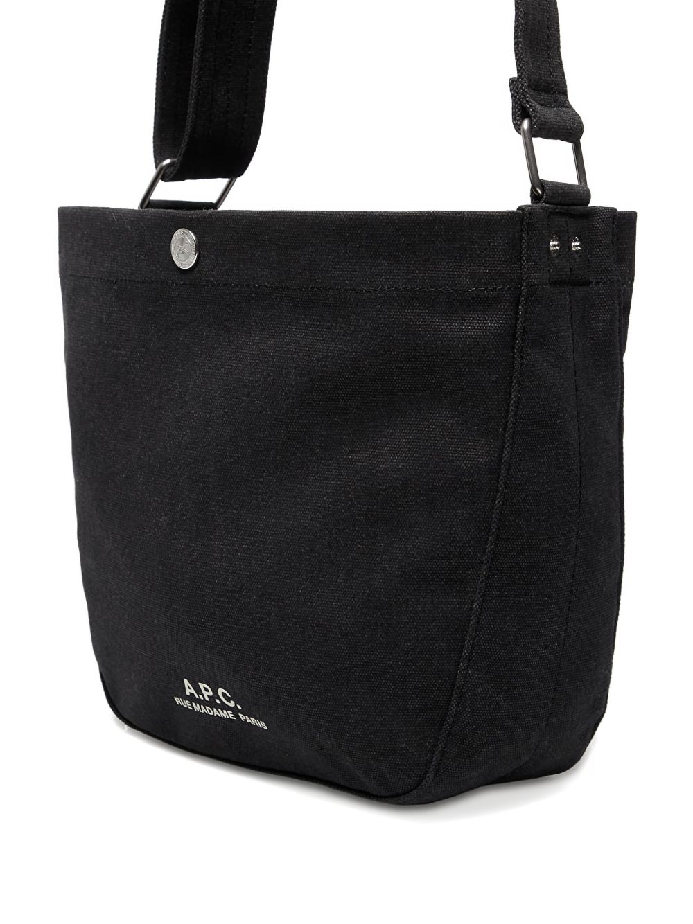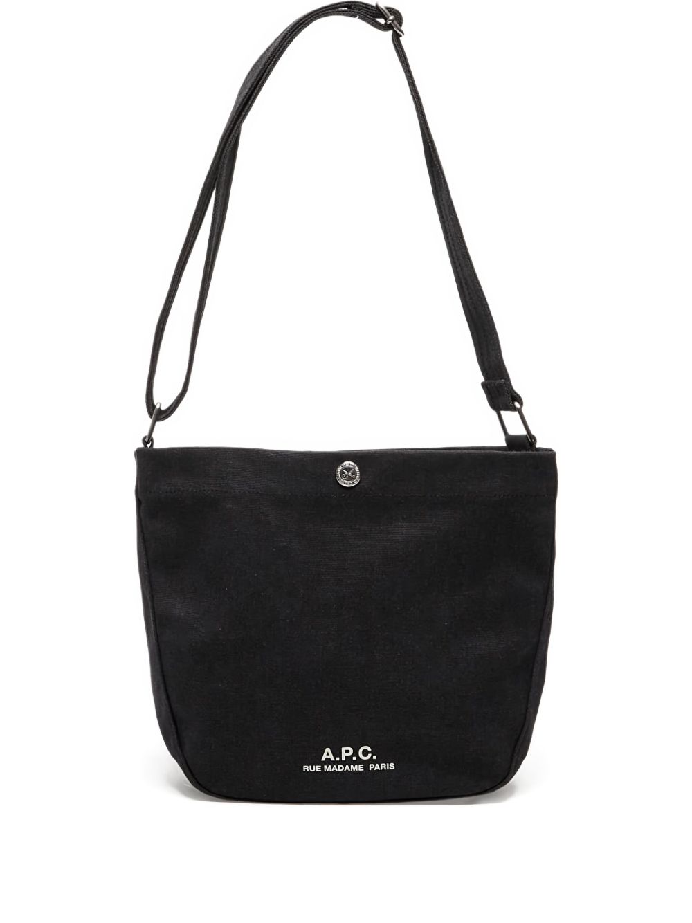 Black cotton Jurnal Satchel bag by A.P.C. with adjustable shoulder strap, press-stud placket closure, front logo print, single compartment, interior slip pocket, and interior patch pocket.
