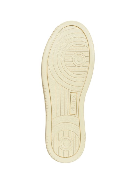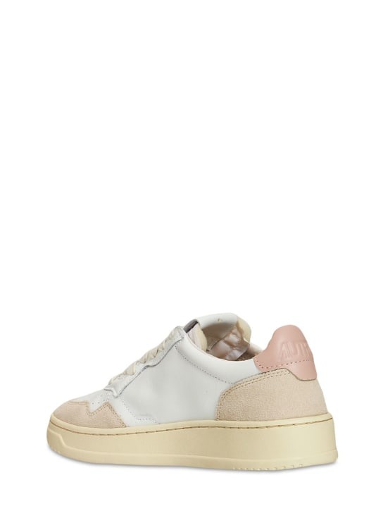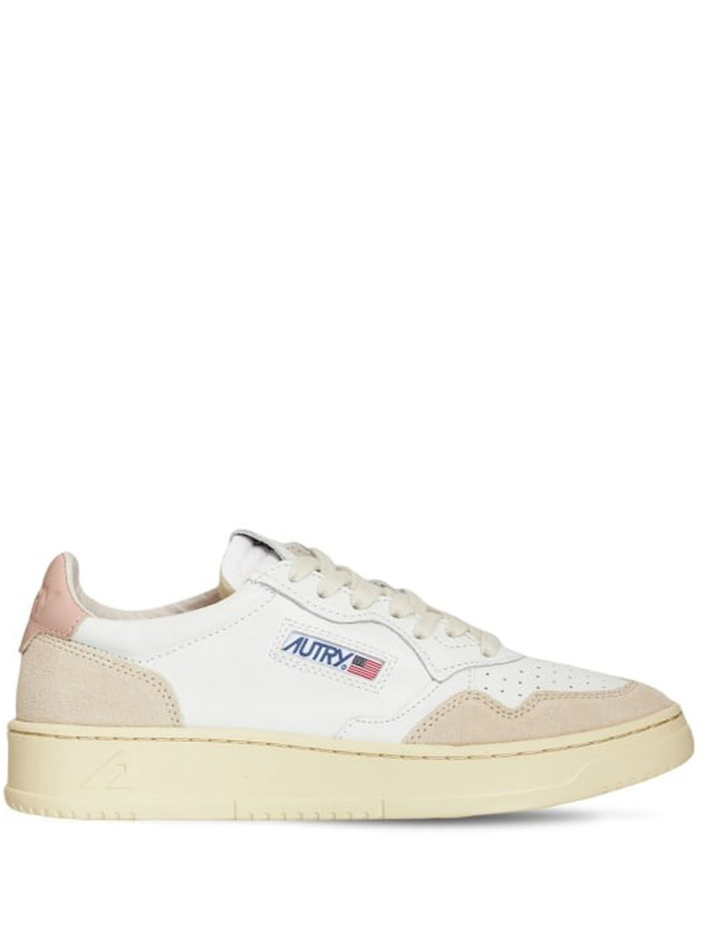 White and beige Medalist Low Aulw LS33 sneakers by Autry in leather with round toe, front lace-up closure, side logo, black heel detail and flat rubber sole.