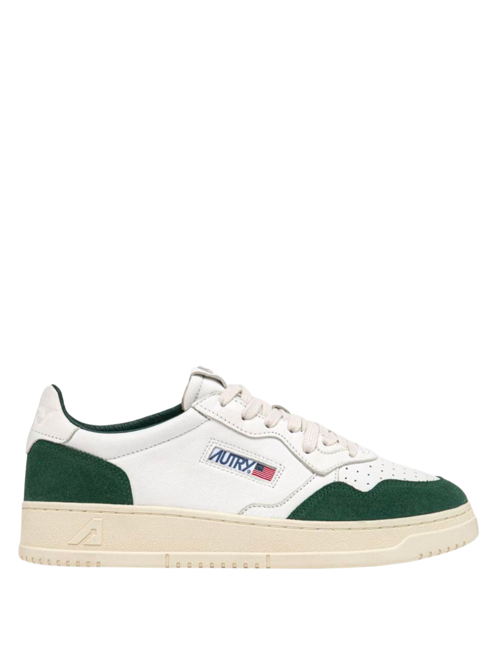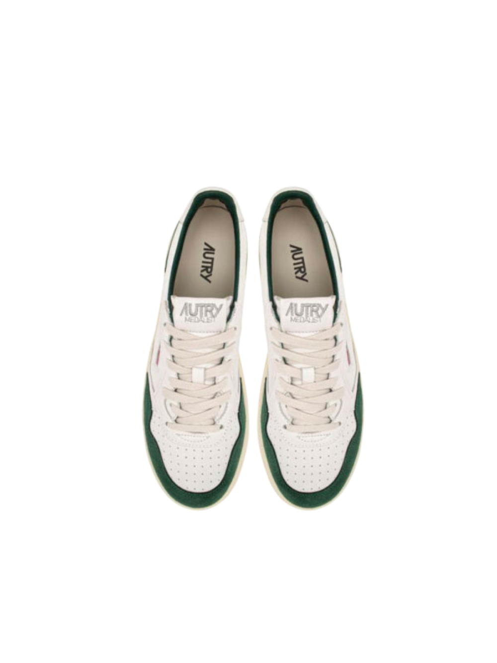 Medalist Low Aulm GS42 white and green sneakers by Autry in leather with round toe, perforated design, lace closure, logo label, black detail and rubber sole.