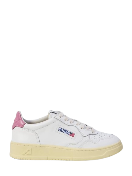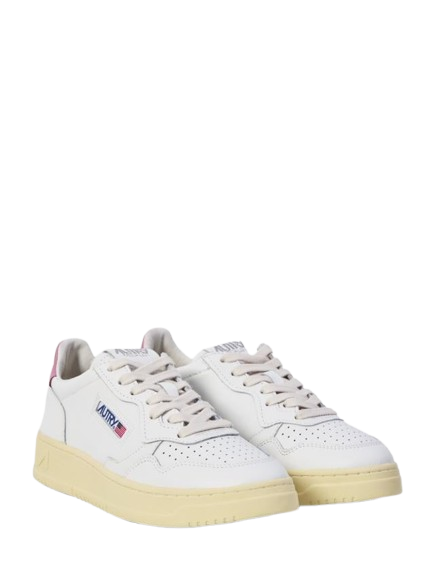 White and pink leather Medalist Aulw Low LL88 sneakers by Autry with round toe, a perforated design, contrasting beige panels, a logo tag, a lace-up closure and a rubber sole.