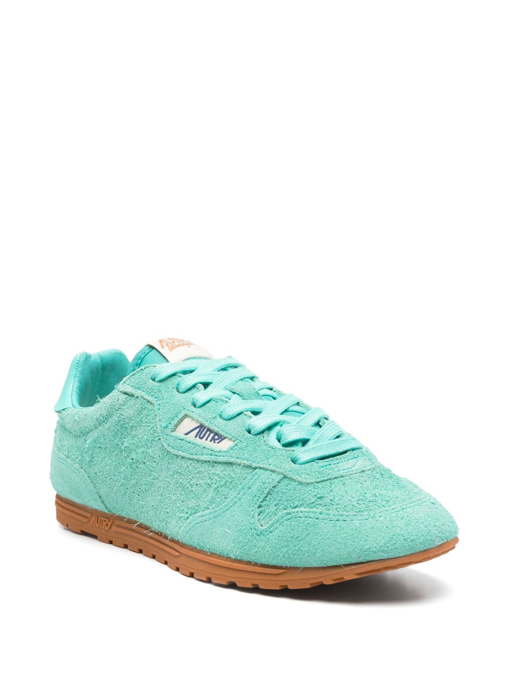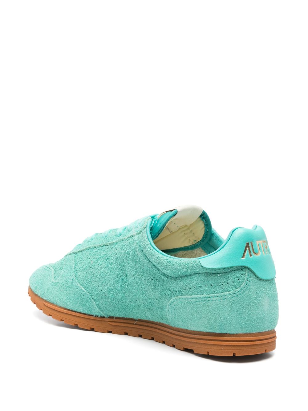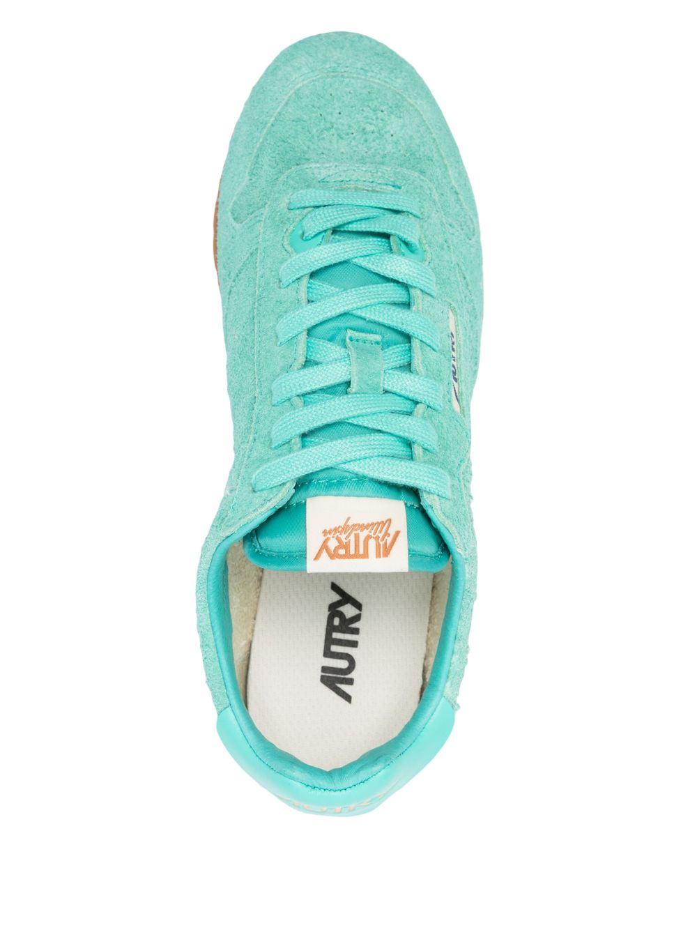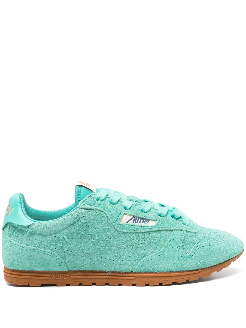 Torquoise leather Windspin women's sneakers by Autry with almond toe, lace-up closure, suede inserts, side logo applique, and contrasting rubber sole.