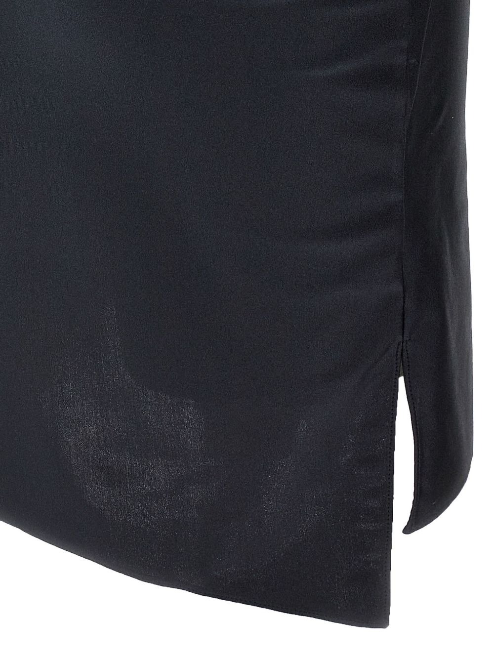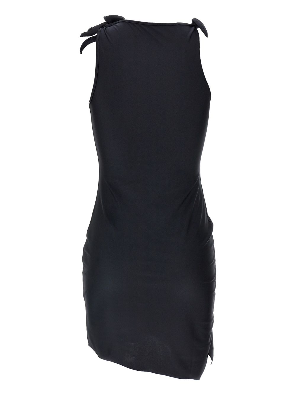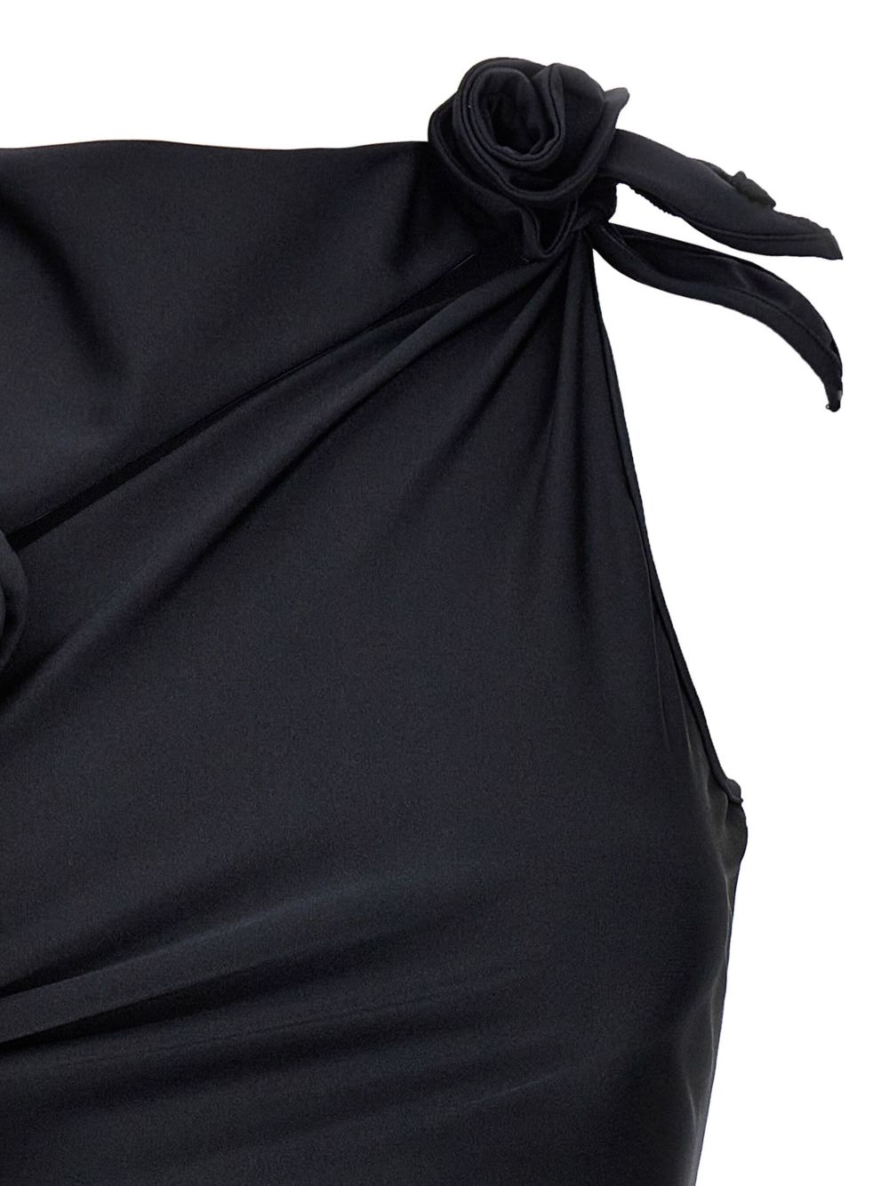 Black Asymmetric Flower dress by Coperni in polyamide with cut-out neckline, fabric rose appliqué, and asymmetrical cut.