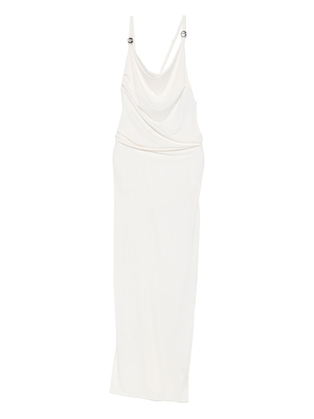 Long white polyester dress by Coperni with a soft neckline, thin straps, metal logo details, crossed straps at the back, and a straight hem.