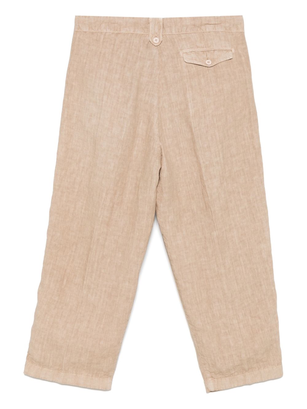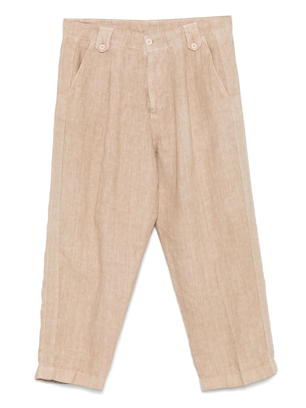 Beige linen Miaky Nairobi trousers by Costumein with concealed zip and button fastening, belt loops, two diagonal side pockets and a back flap pocket.
