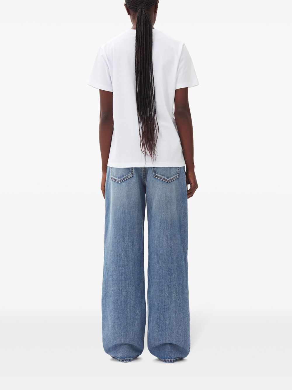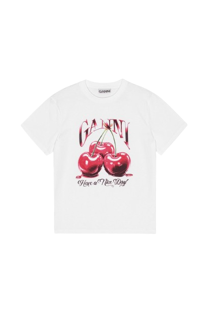 White Cherry cotton T-shirt by Ganni with crew neck, short sleeves, front print and straight hem.