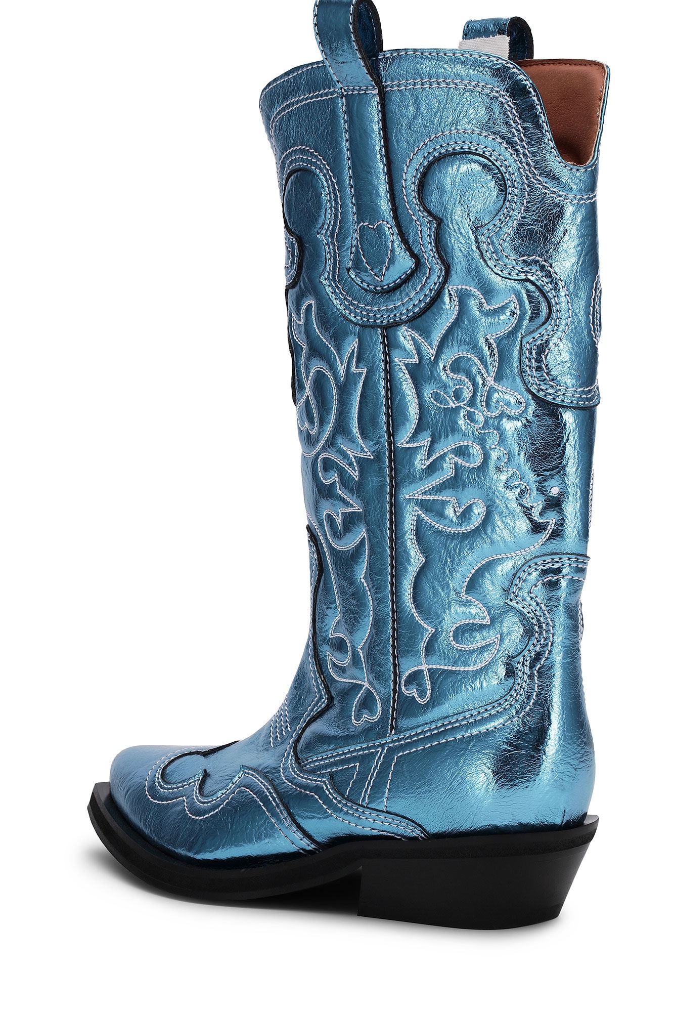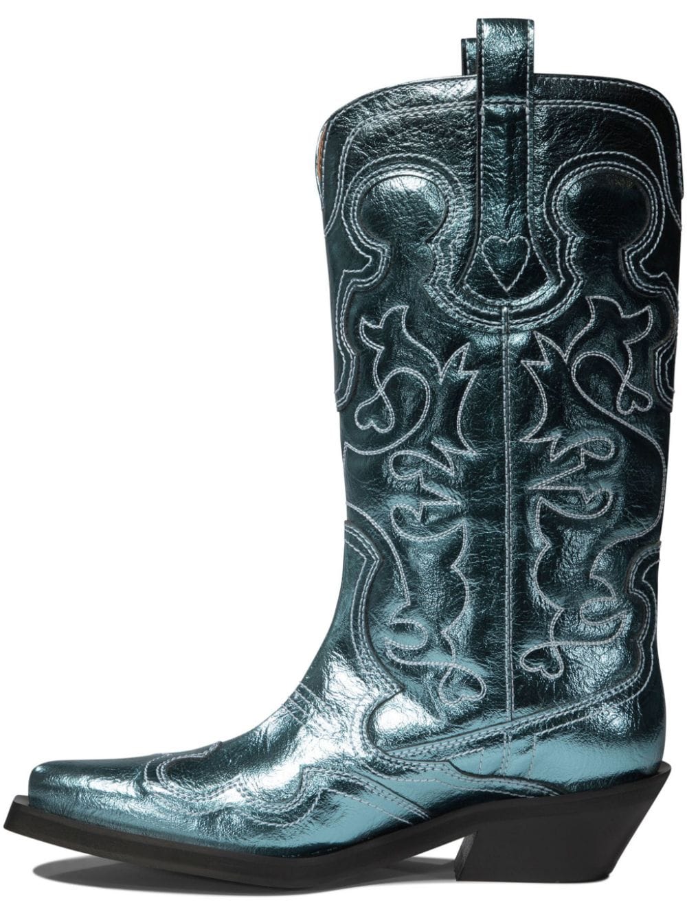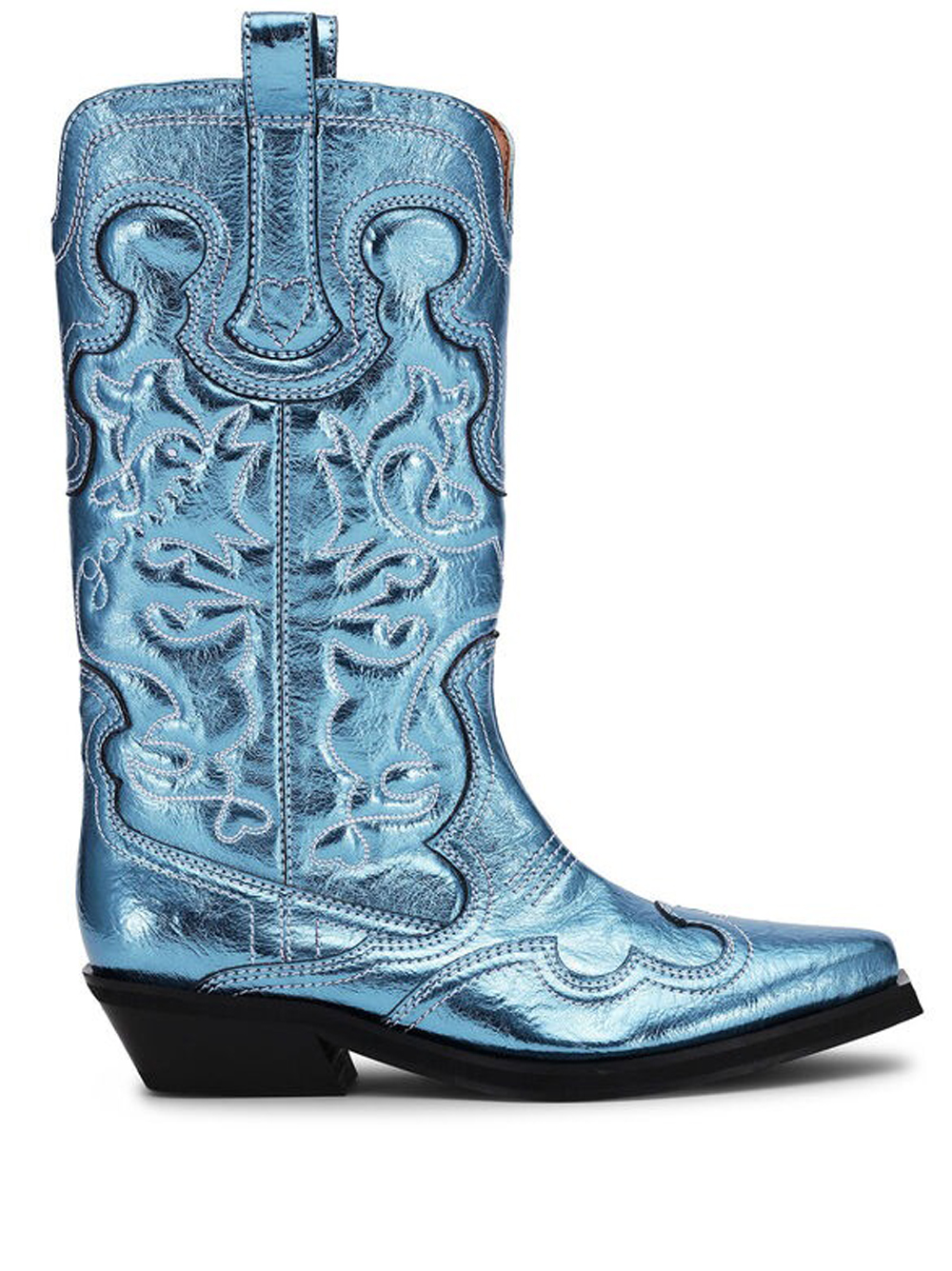 Blue Mid Shaft Embroidered Western boots by Ganni featuring in polyester whit pointed toe design, a midi silhouette, top tabs, western styling, all-over stitching embroidery and a cubic heel.