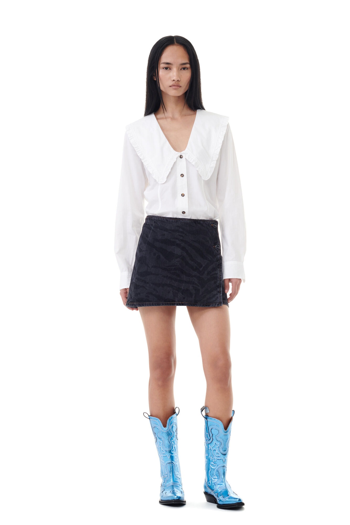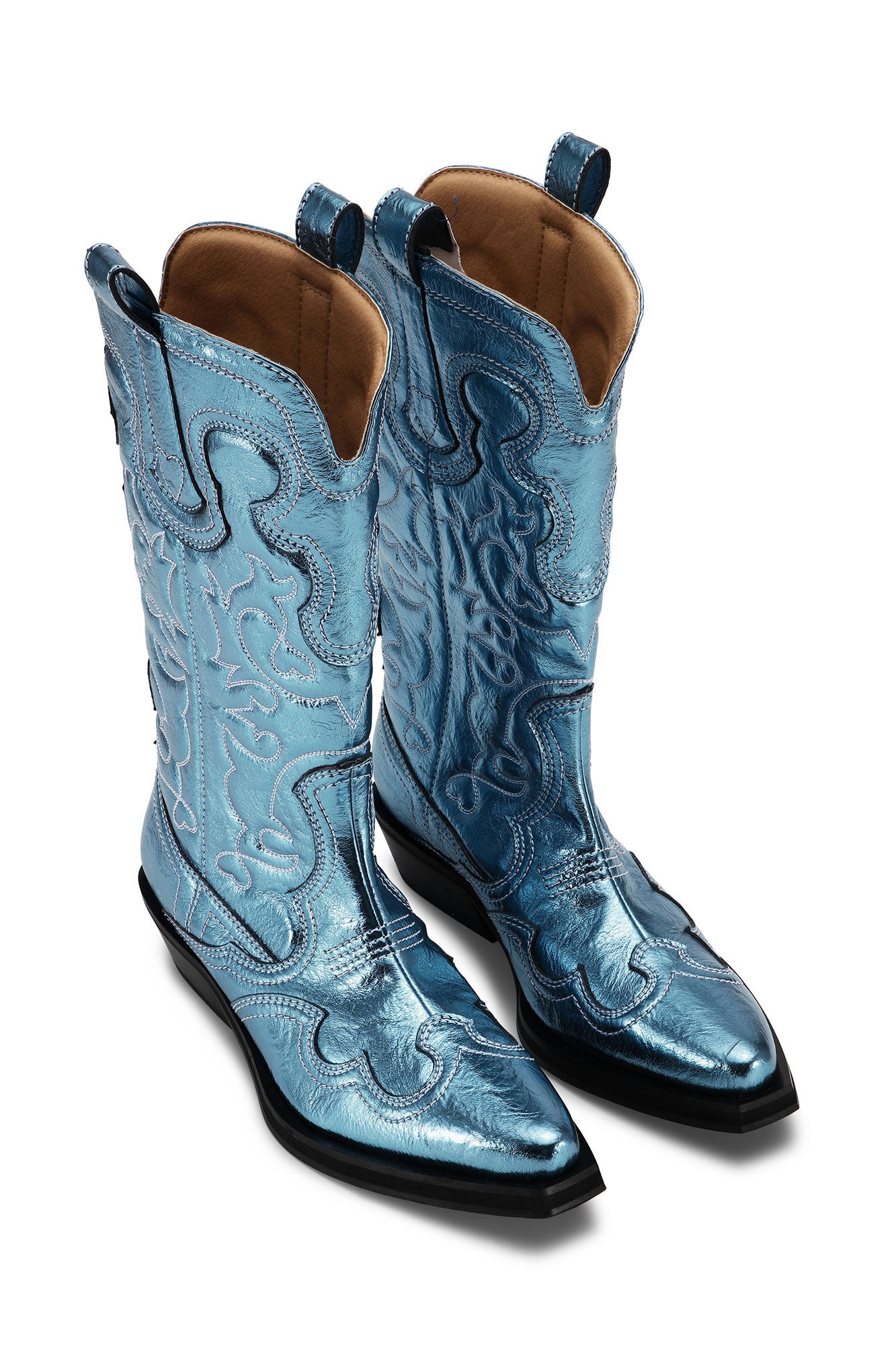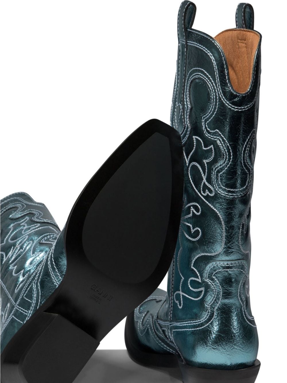 Blue Mid Shaft Embroidered Western boots by Ganni featuring in polyester whit pointed toe design, a midi silhouette, top tabs, western styling, all-over stitching embroidery and a cubic heel.