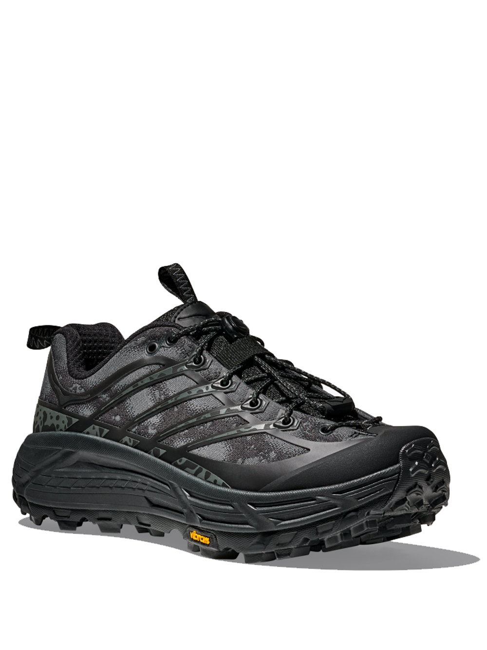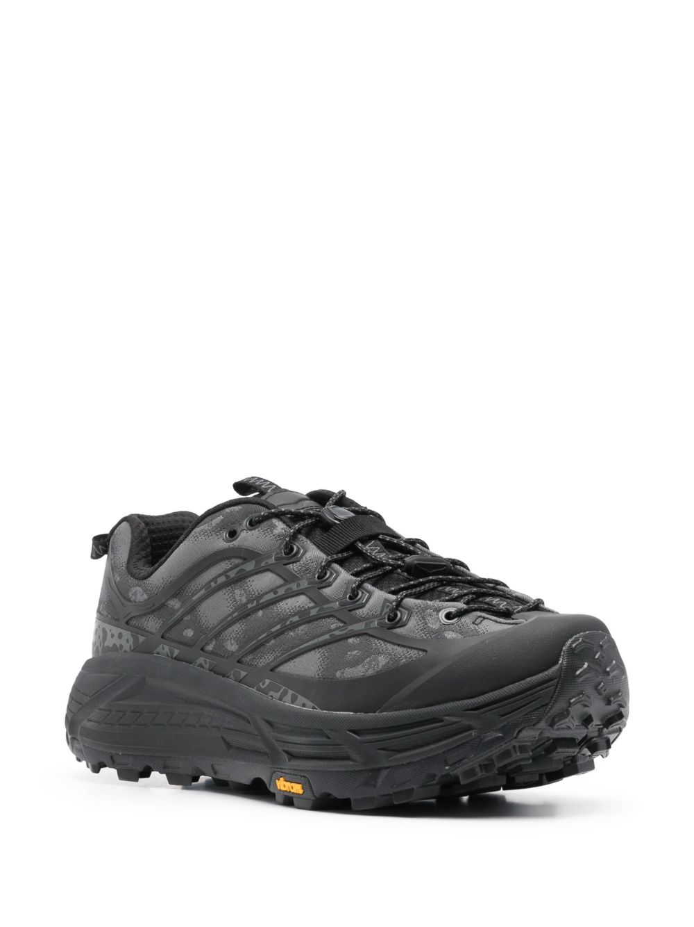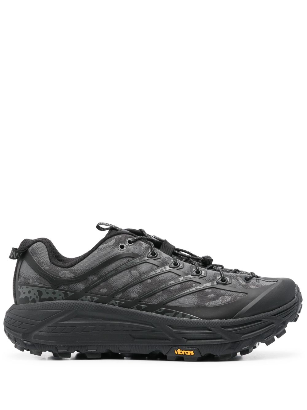 Black Stealth/Tech Mafate Three2 sneakers by Hoka One One featuring an inset design, heel tab, round toe, front lace-up closure, logo insole, mottled effect sole and Vibram® sole.