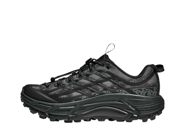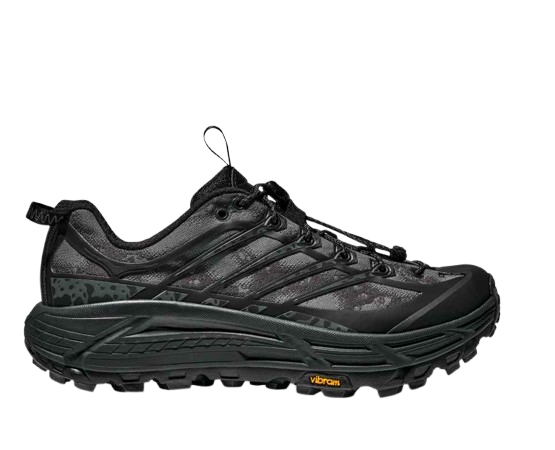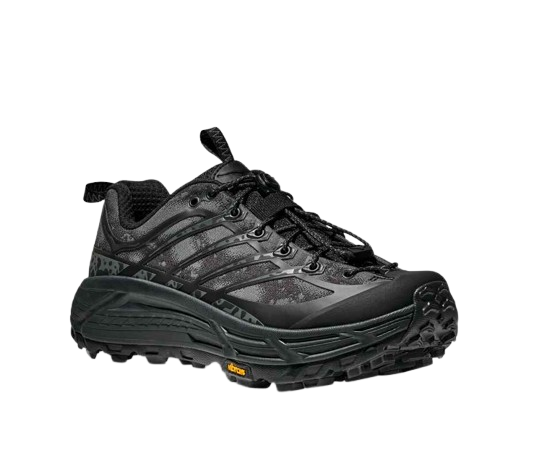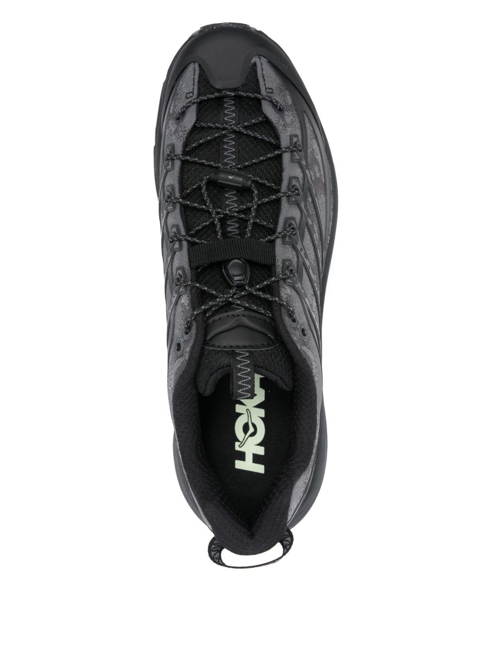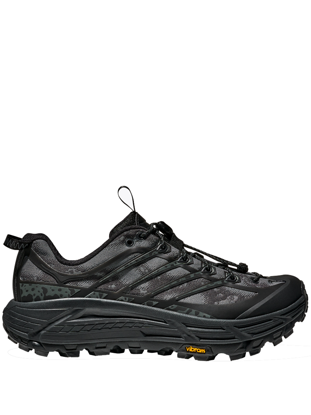Black Stealth/Tech Mafate Three2 sneakers by Hoka One One featuring an inset design, heel tab, round toe, front lace-up closure, logo insole, mottled effect sole and Vibram® sole.
