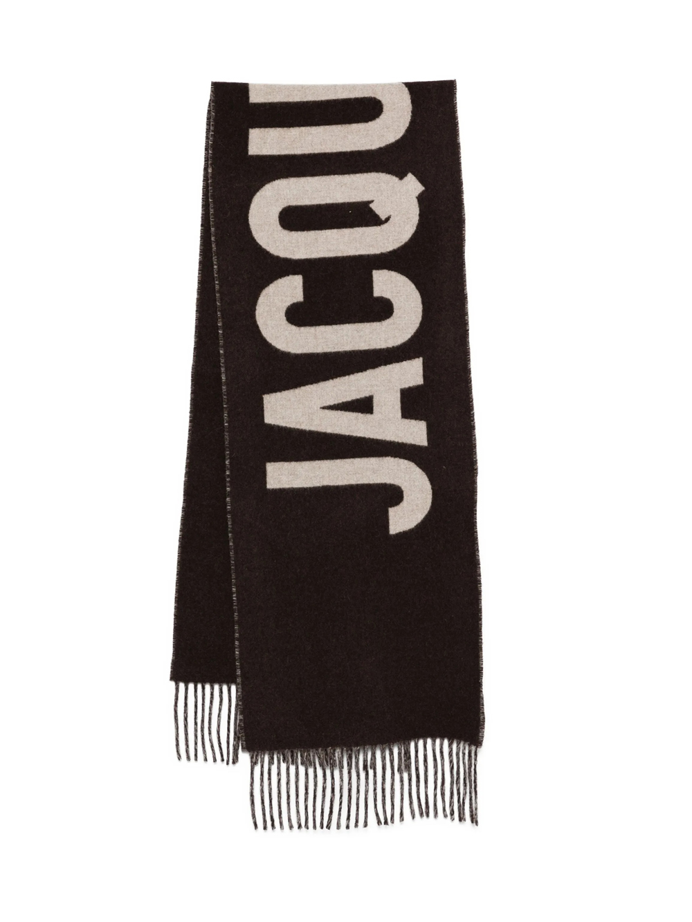 L'Écharpe Jacquemus brown wool scarf with jacquard logo, double-sided design and fringed hem.