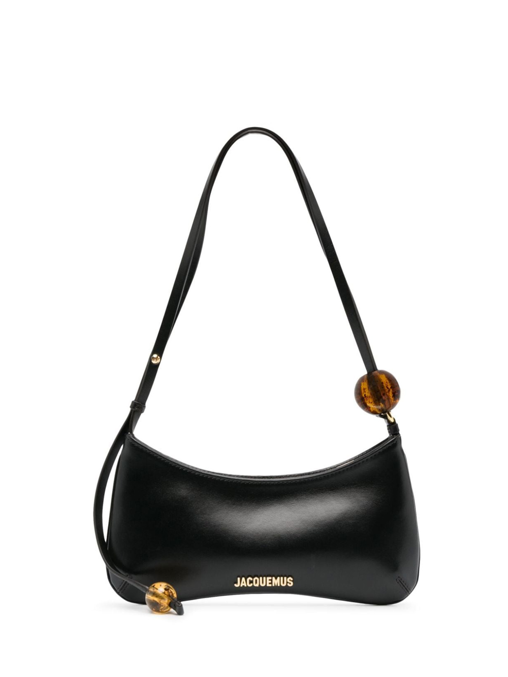 Black Le Bisou Perle bag by Jacquemus in leather whit wavy silhouette, a zipper closure, an inside pocket, a gold-tone logo applique, a contrasting shoulder strap and pearl detail.