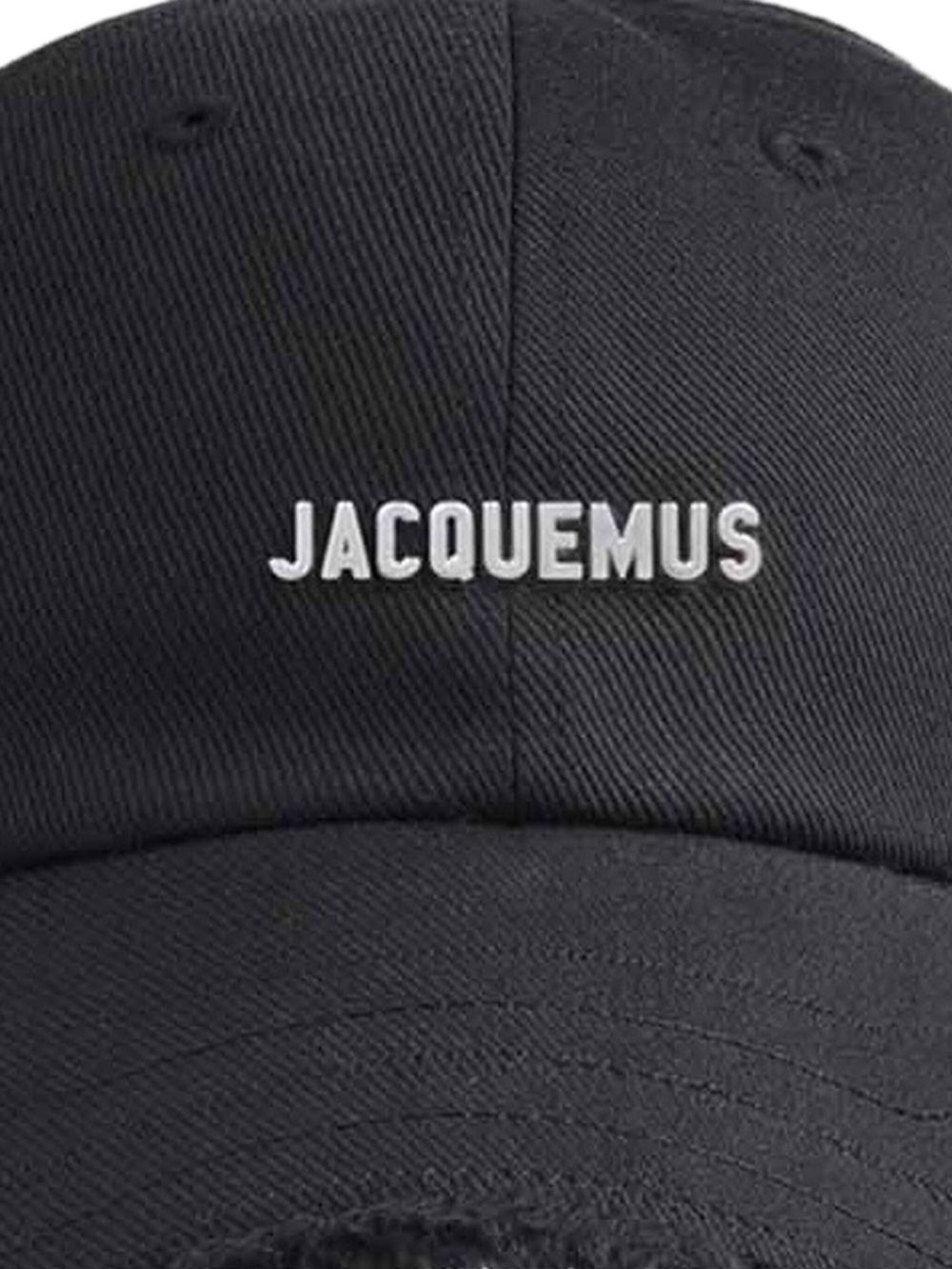 Black Le Casquette Artichaut hat by Jacquemus in cotton with adjustable drawstring, metal logo appliqué, curved brim and frayed hem.
