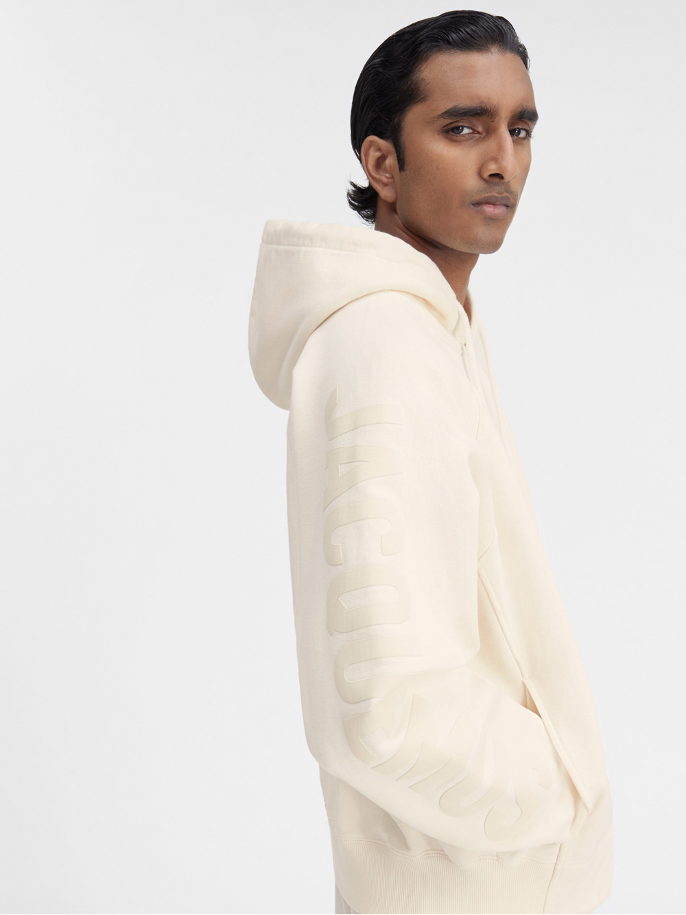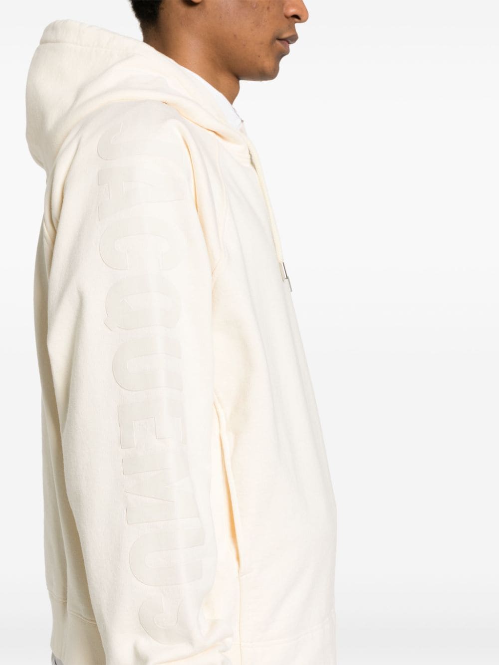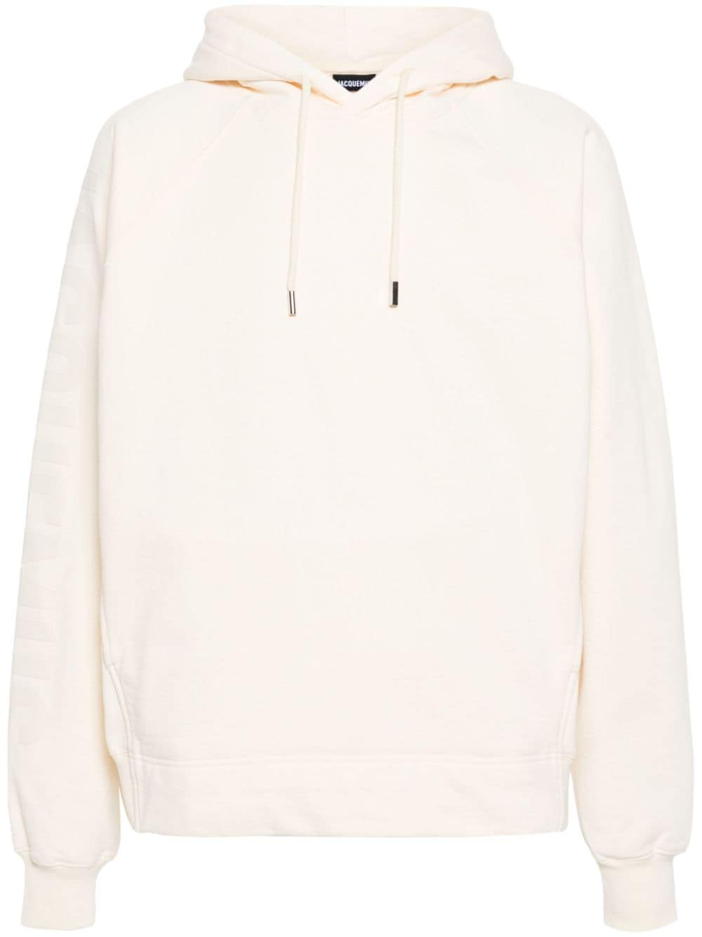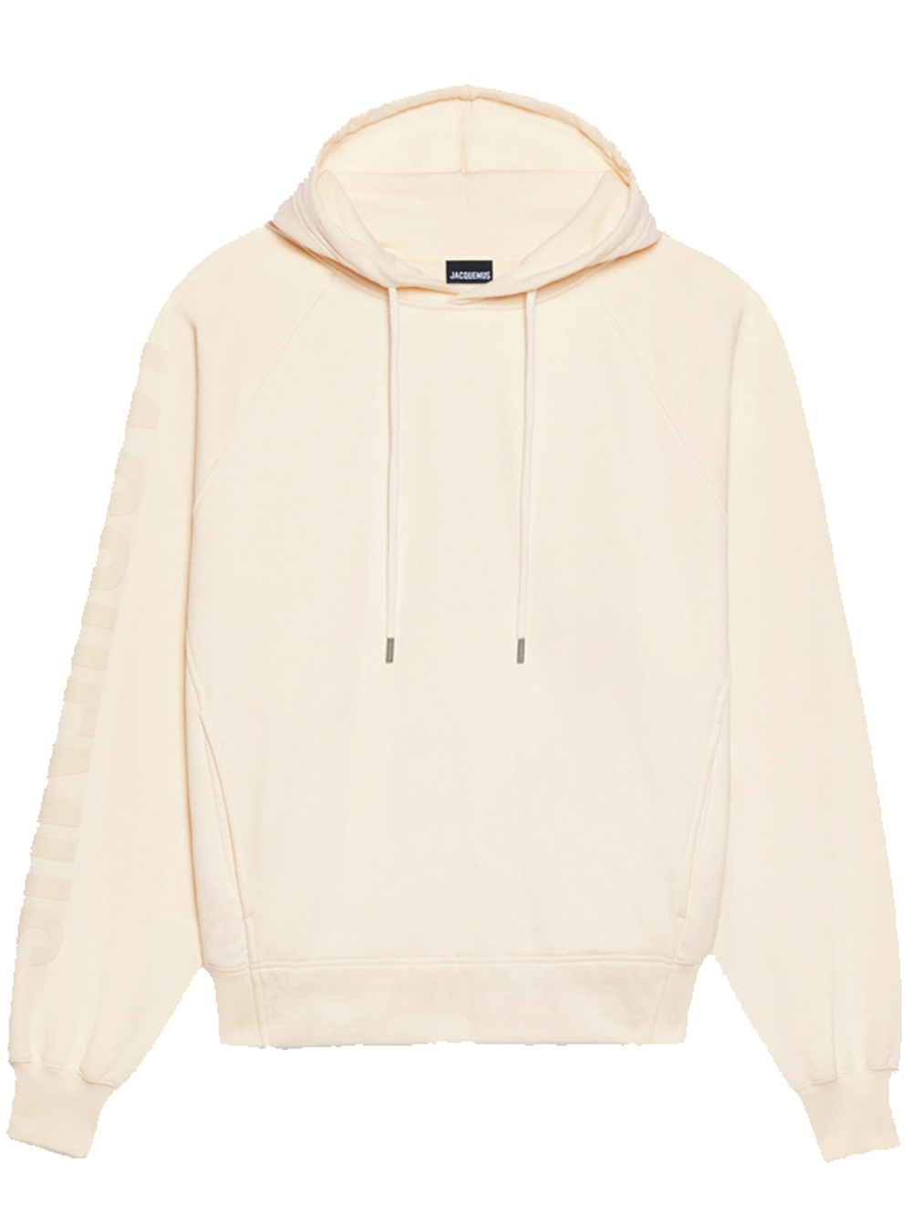 Beige Le Hoodie Typo by Jacquemus in cotton with hood, drawstring, ribbed finishes, logo printed on the sleeve, kangaroo pocket and straight hem.