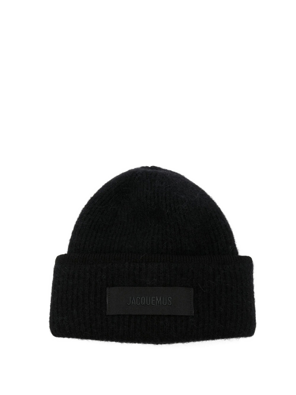 Black Le Bonnet Gros Grain hat by Jacquemus in wool with red embroidered logo, turned-up hem, and ribbed knit.