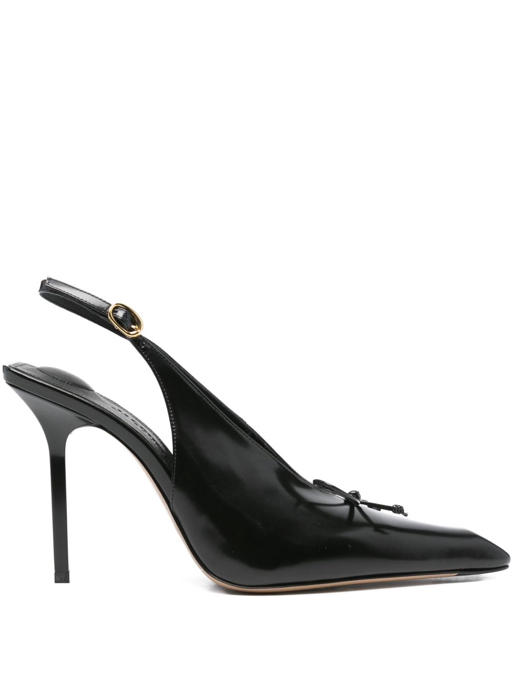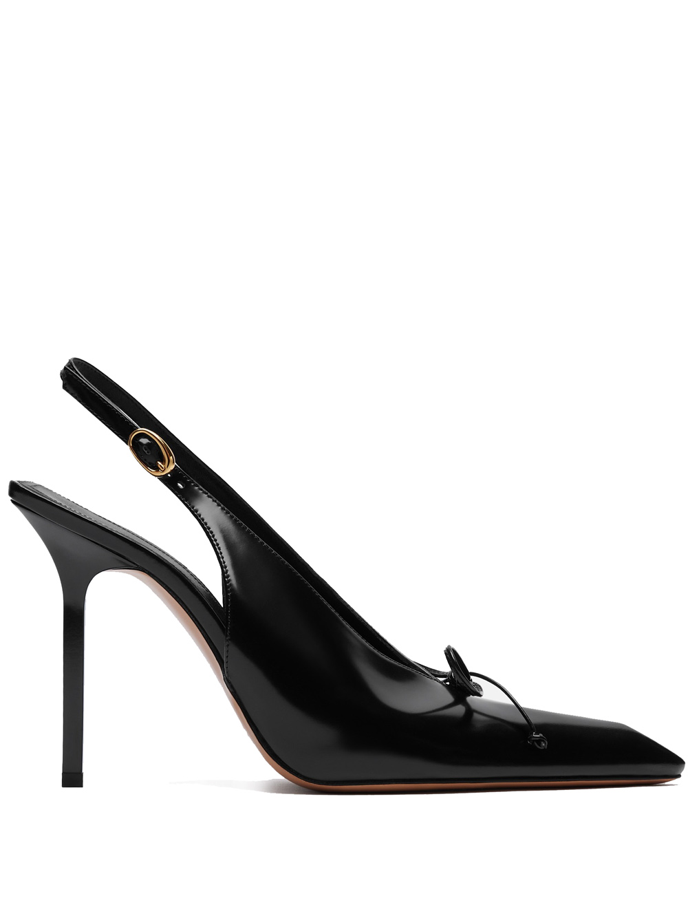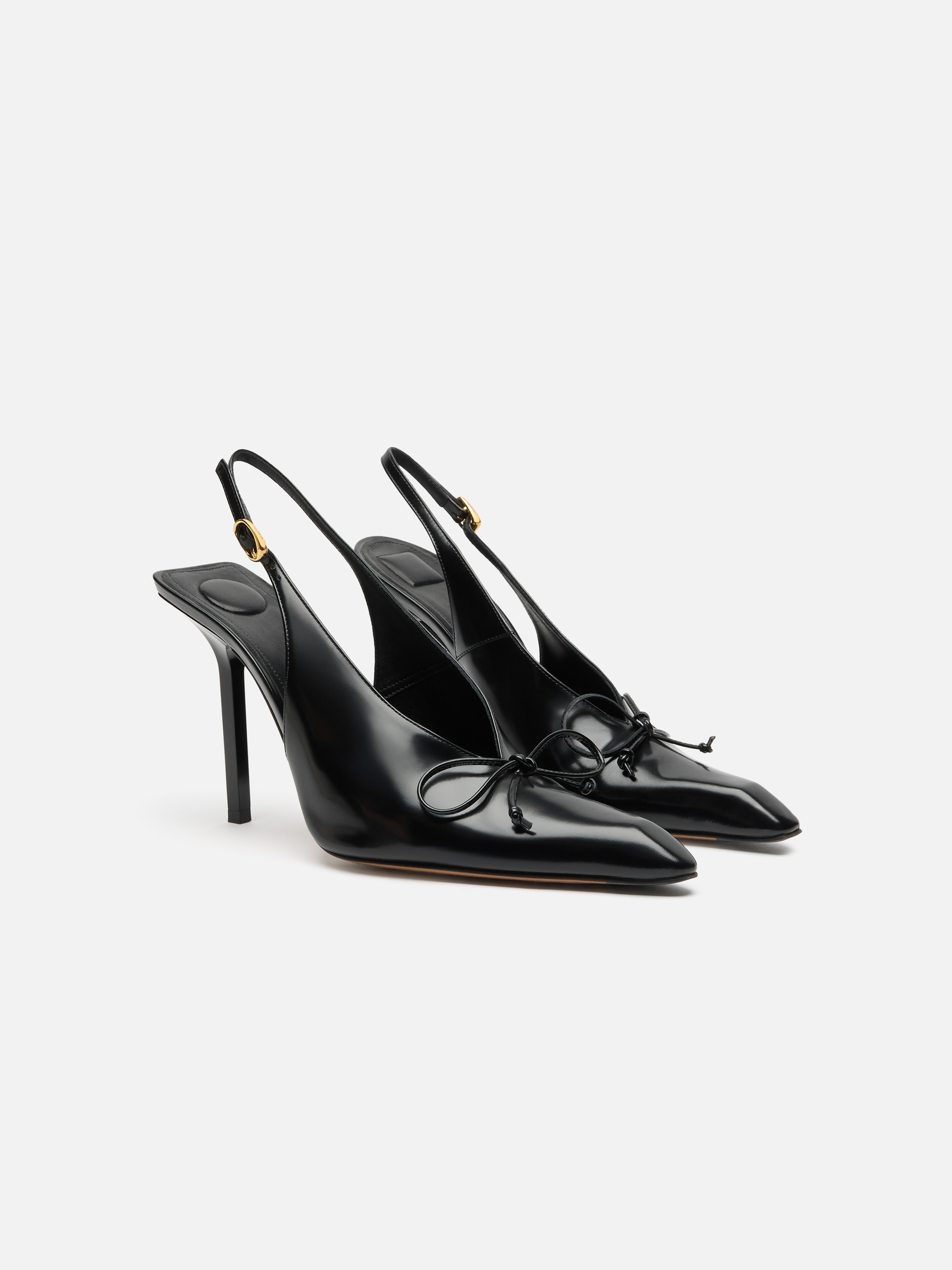 Black pumps Jacquemus' Cubisto slingbacks in leather with matching leather bow, geometric toe, leather sole and interior, embossed logo on the insole, and round, square heel.