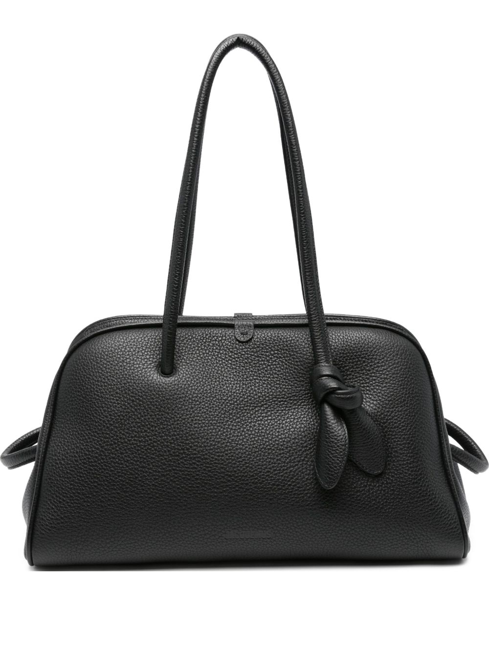 Jacquemus black leather Le Turismo bag with handles, knot detail, and zip closure.