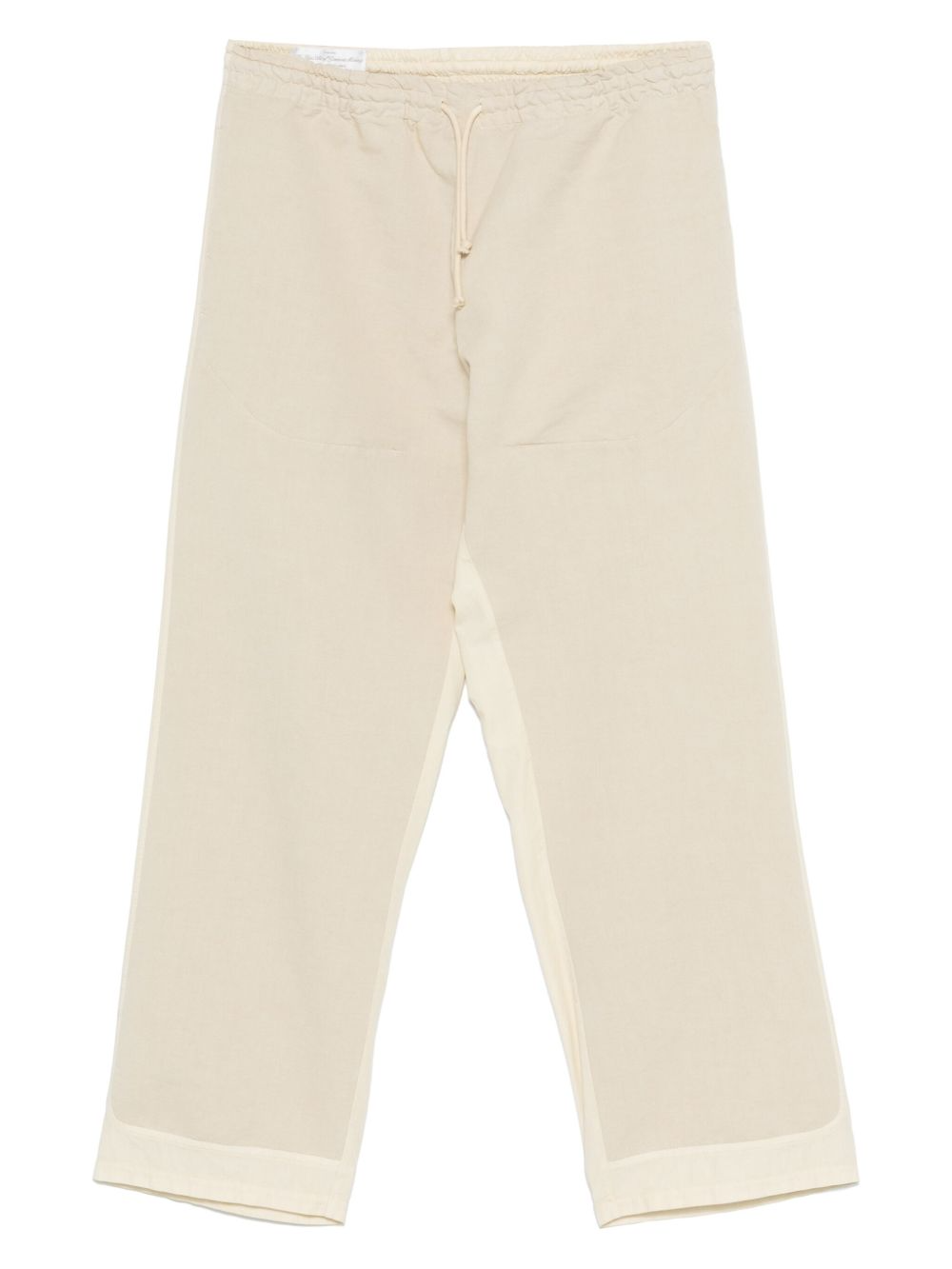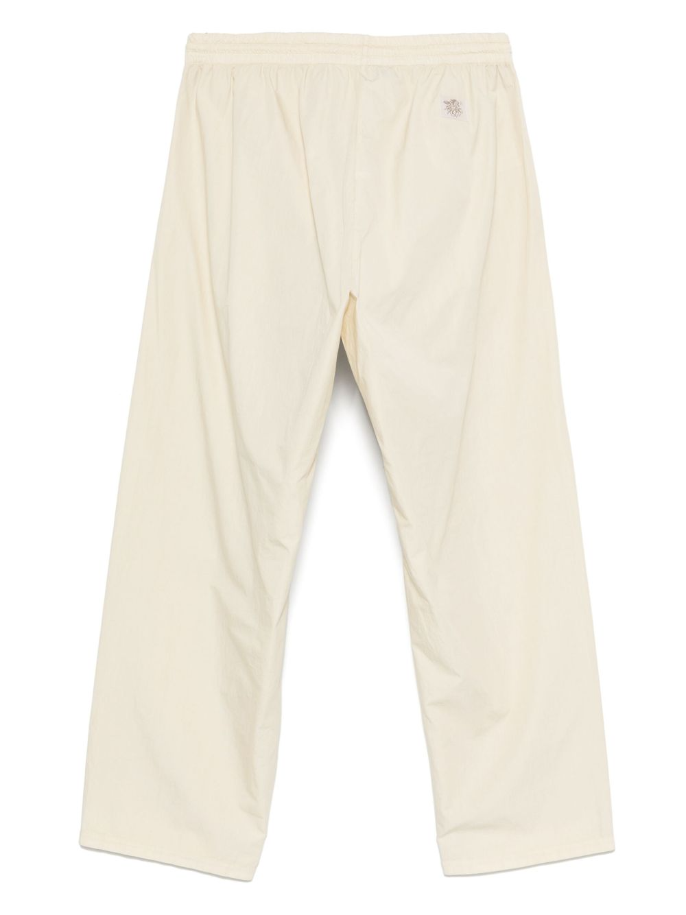 Beige cotton Rover pants by Ranra with elasticized drawstring waistband, two side button pockets, a back logo applique, and a straight hem.