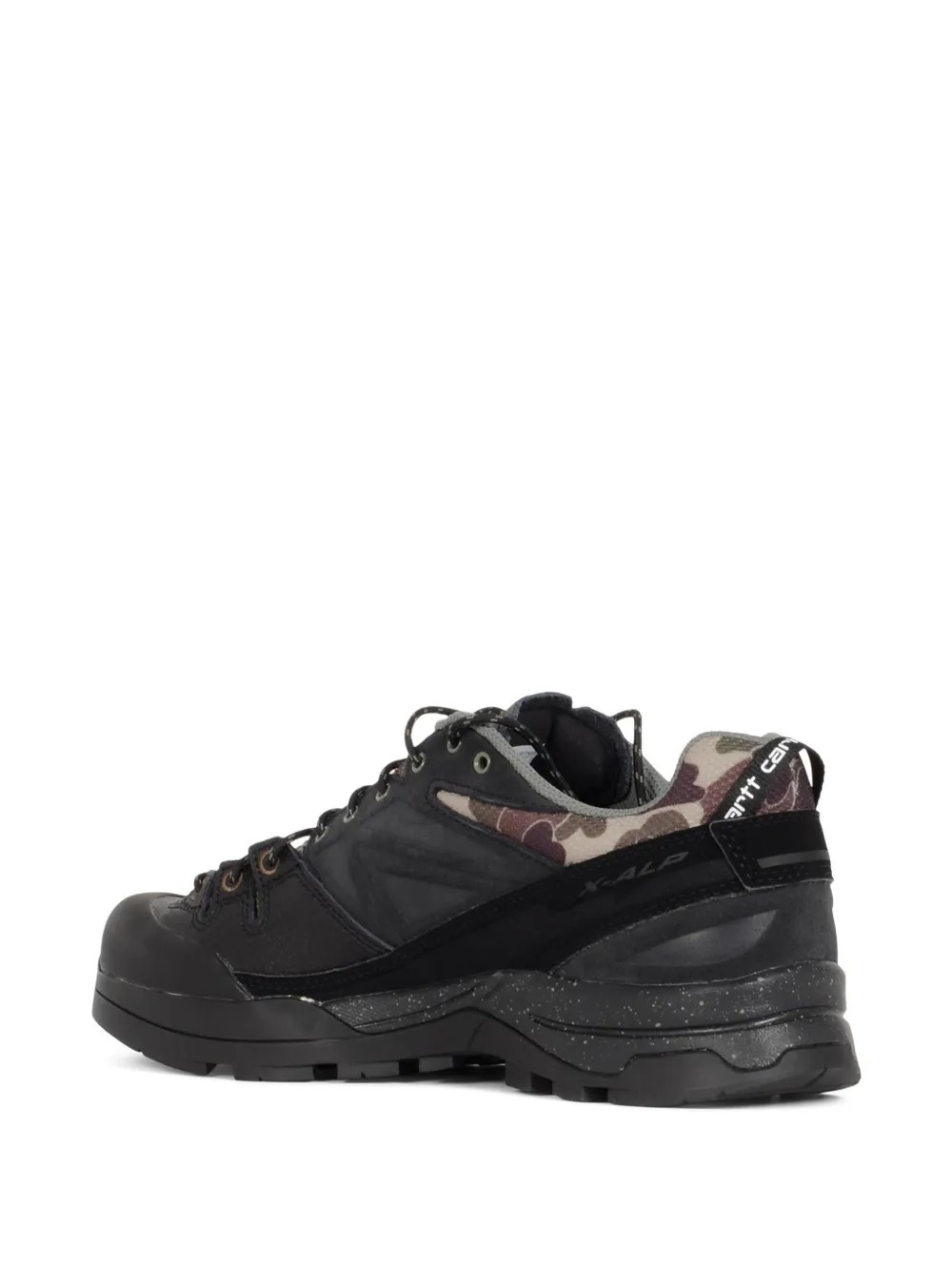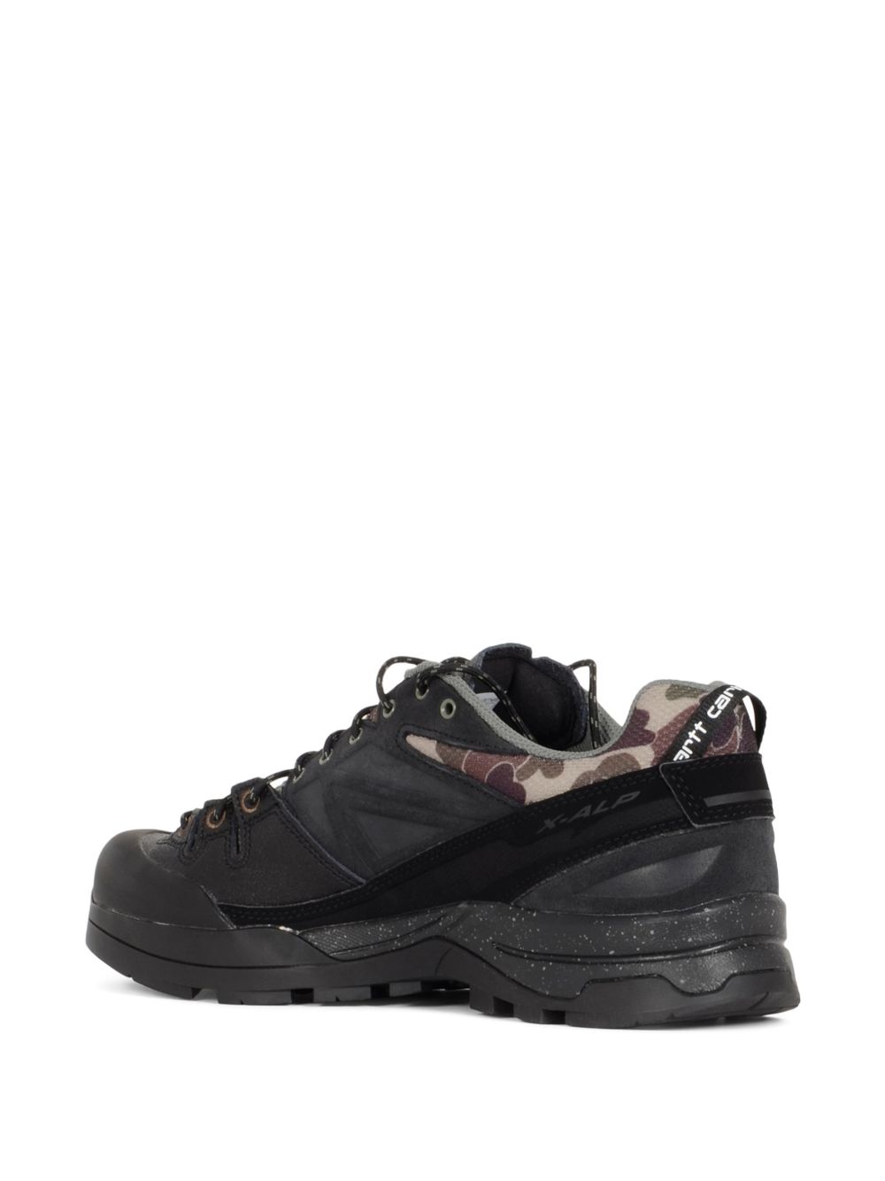 Sneakers nera X-ALP di Salomon x Carhartt in suede con punta tonda, chiusura con lacci, logo laterale e suola in gomma.
