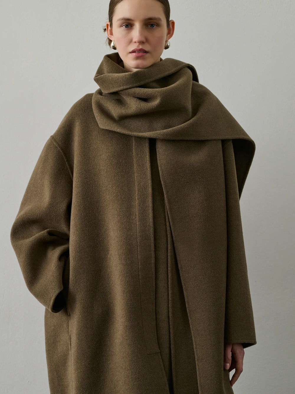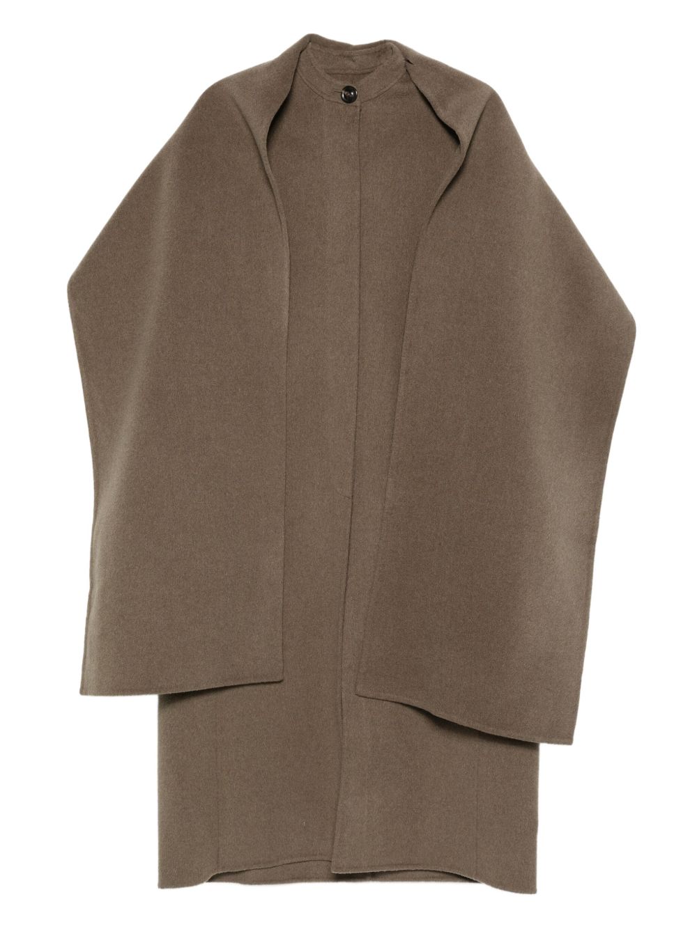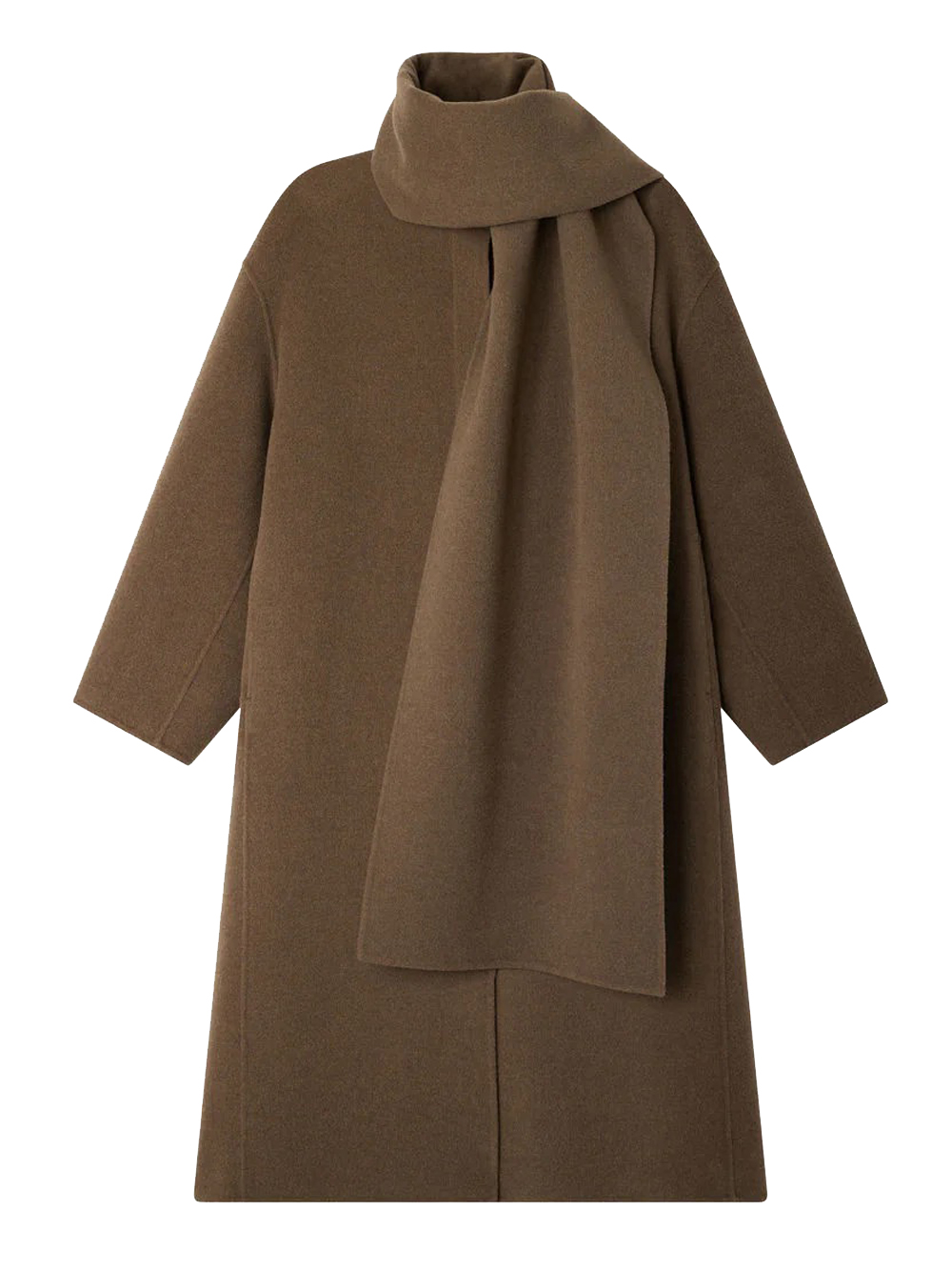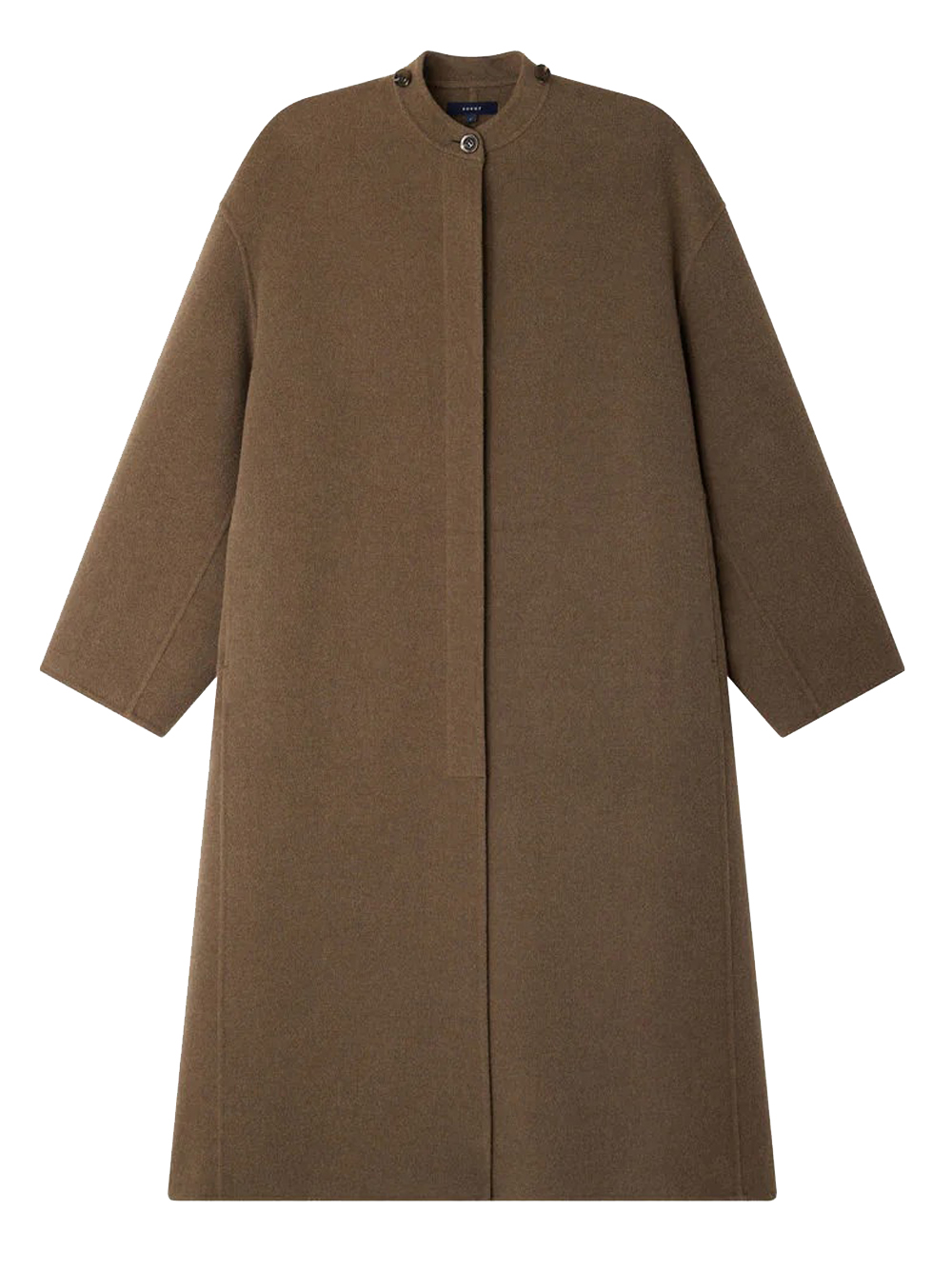 Beige gray Finn coat by Soeur in wool with removable scarf collar, hidden button closure, side pockets, and straight hem.