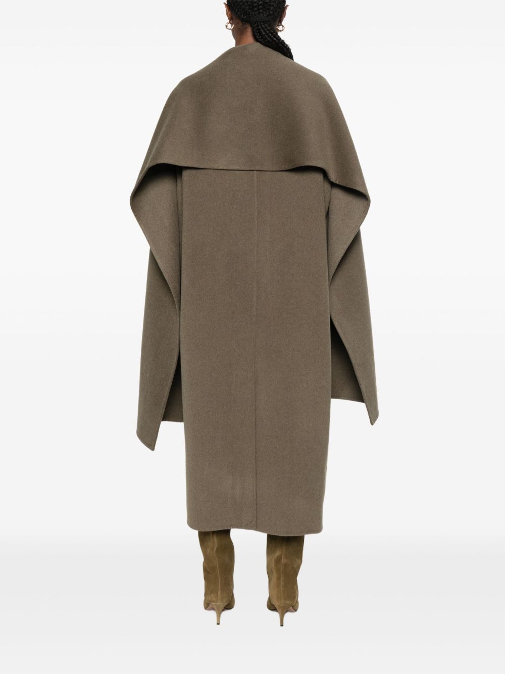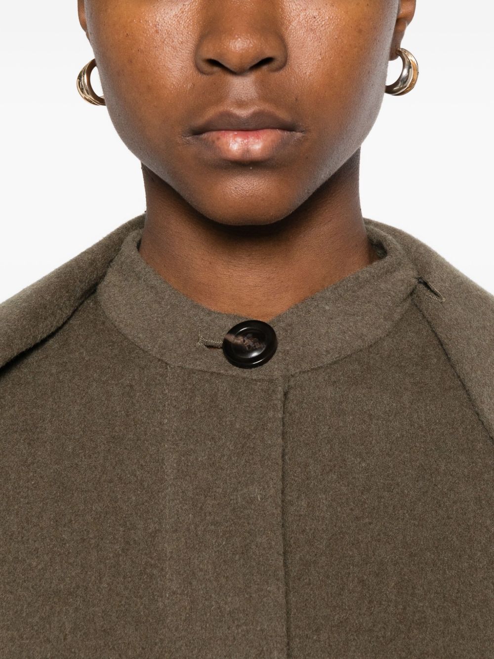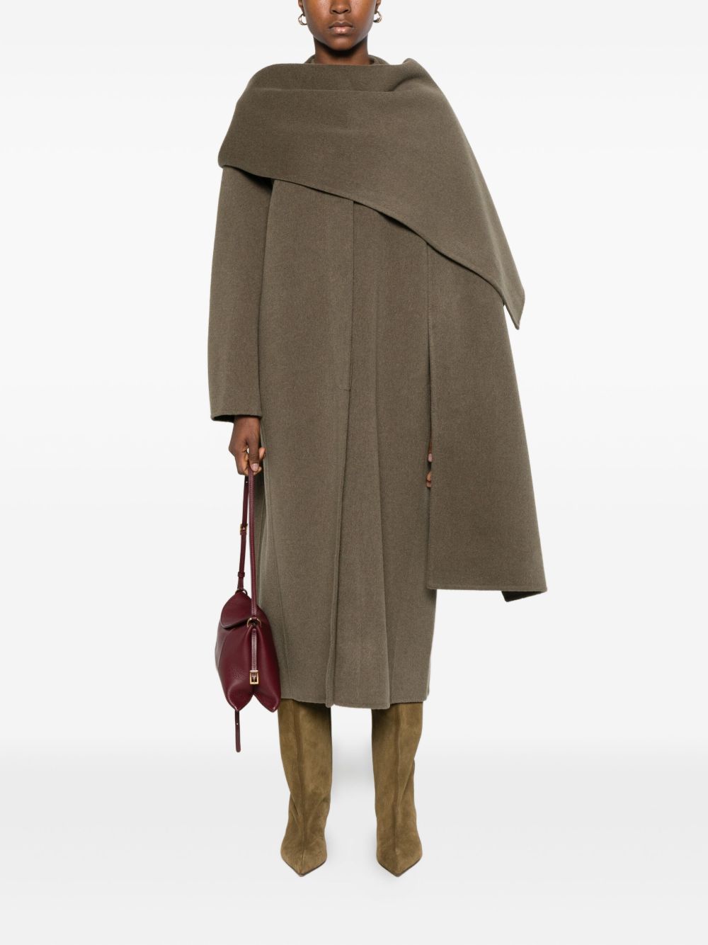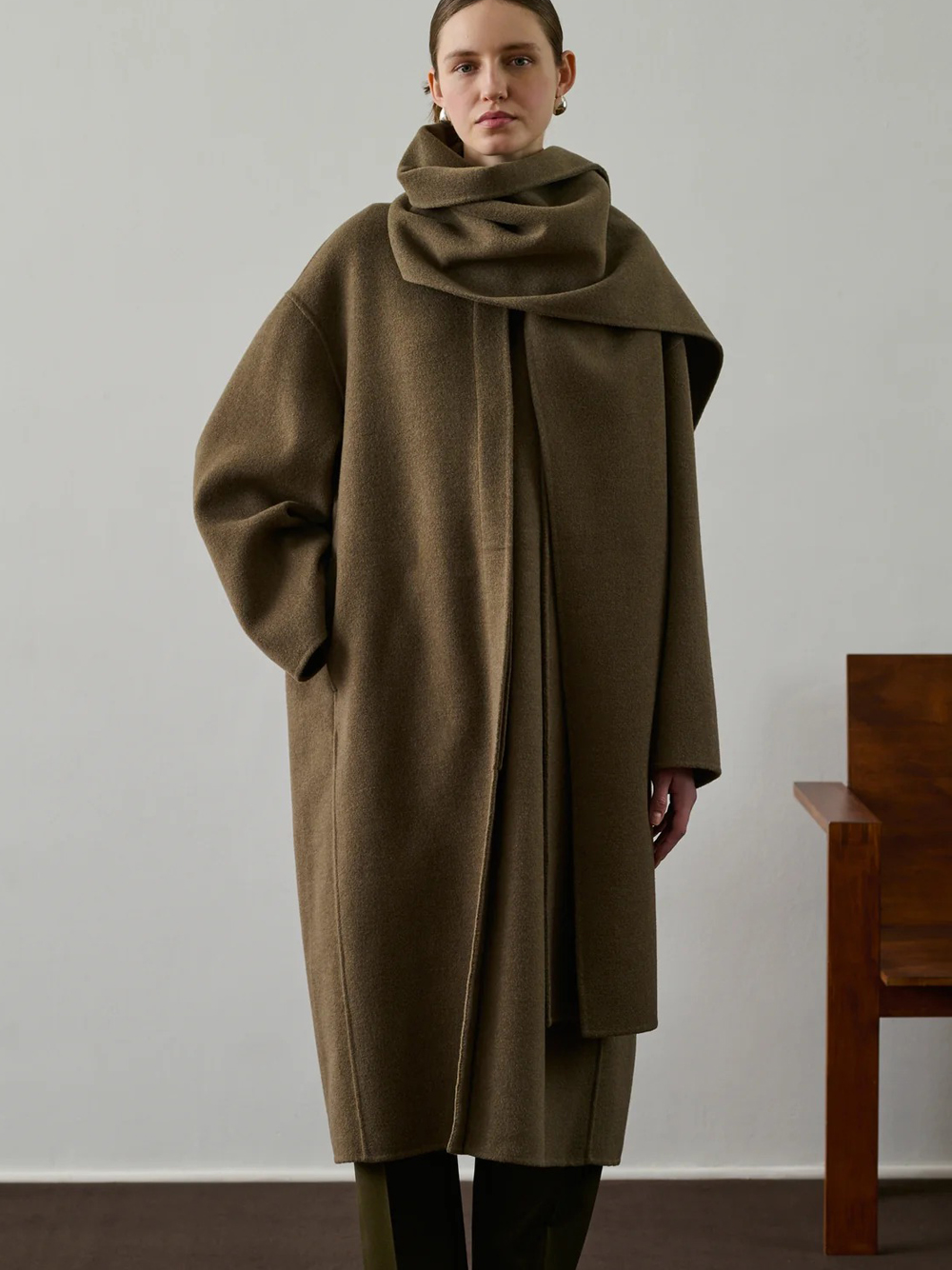 Beige gray Finn coat by Soeur in wool with removable scarf collar, hidden button closure, side pockets, and straight hem.