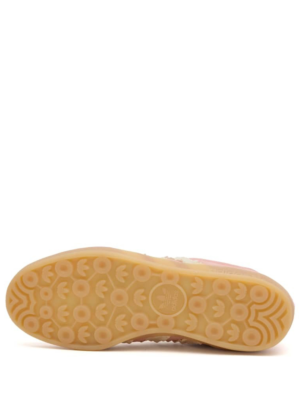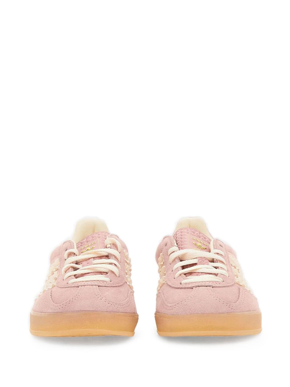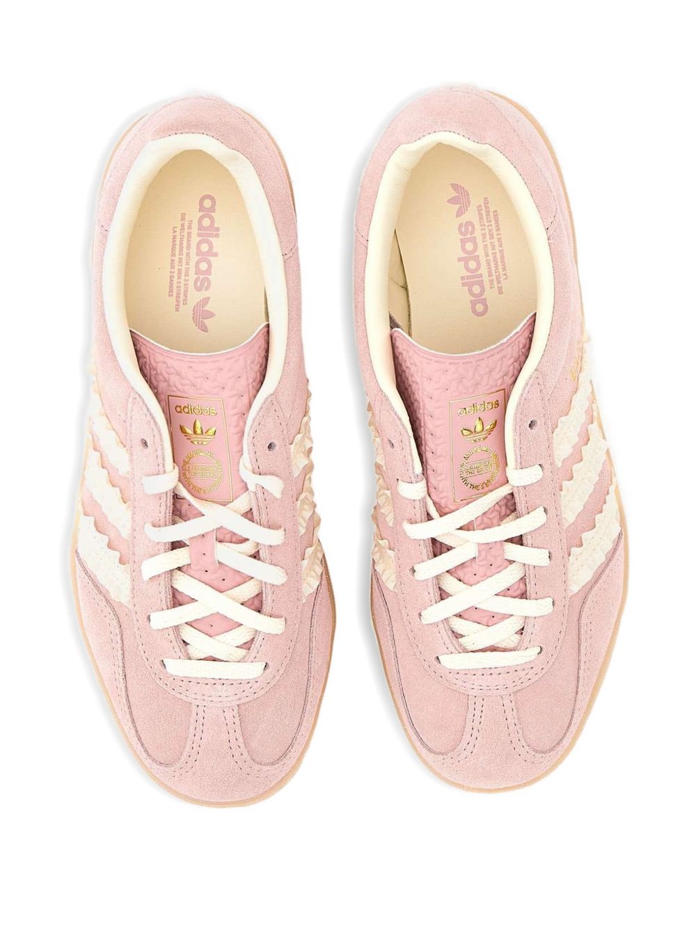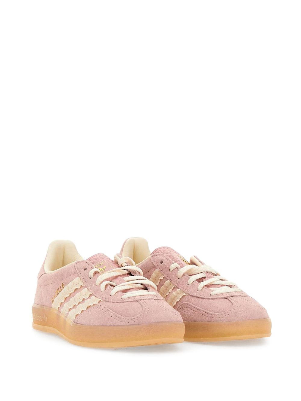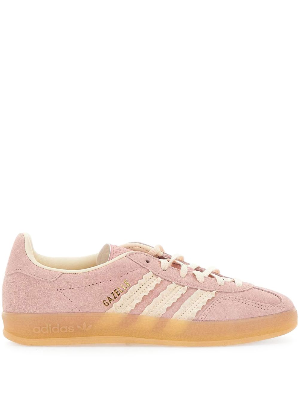 Sneakers rosa Gazelle Indoor W di Adidas in pelle scamosciata con punta tonda, chiusura con lacci frontali, dettagli neri con nastro e suola a contrasto piatta in gomma.