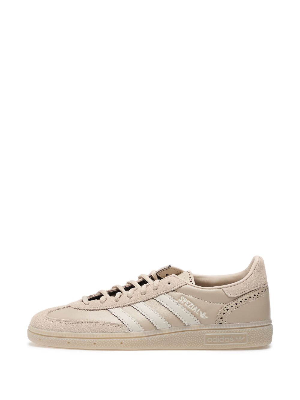 Sneakers beige Handball Spezial di Adidas in pelle con punta tonda, chiusura con lacci sul davanti, dettaglio caratteristico 3-Stripes sui lati, etichetta posteriore con logo e linguetta con logo.
