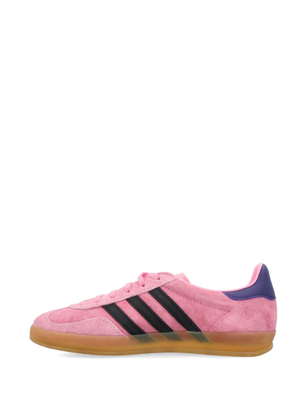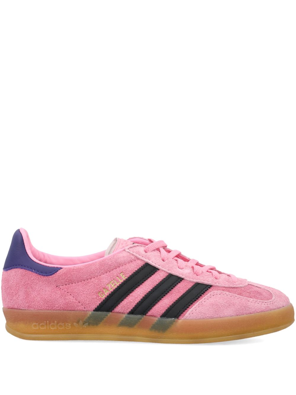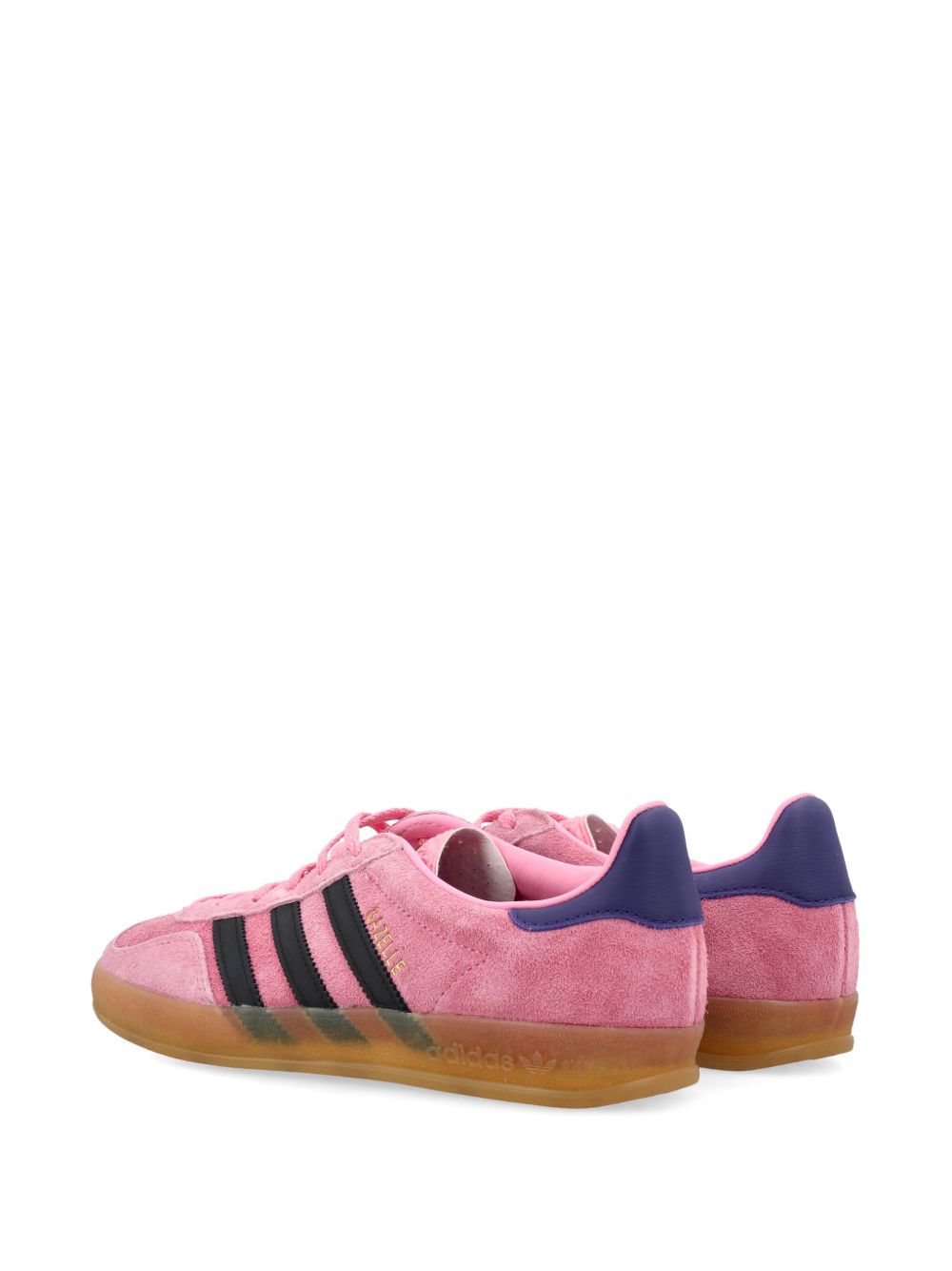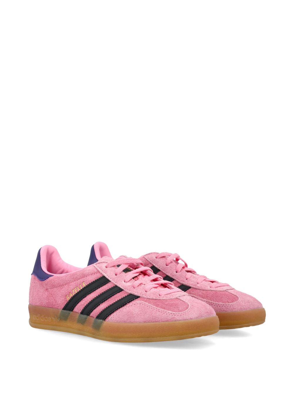 Sneakers rosa Gazelle Indoor W di Adidas in pelle scamosciata con punta tonda, chiusura con lacci frontali, dettagli bianchi laterali e suola a contrasto piatta in gomma.