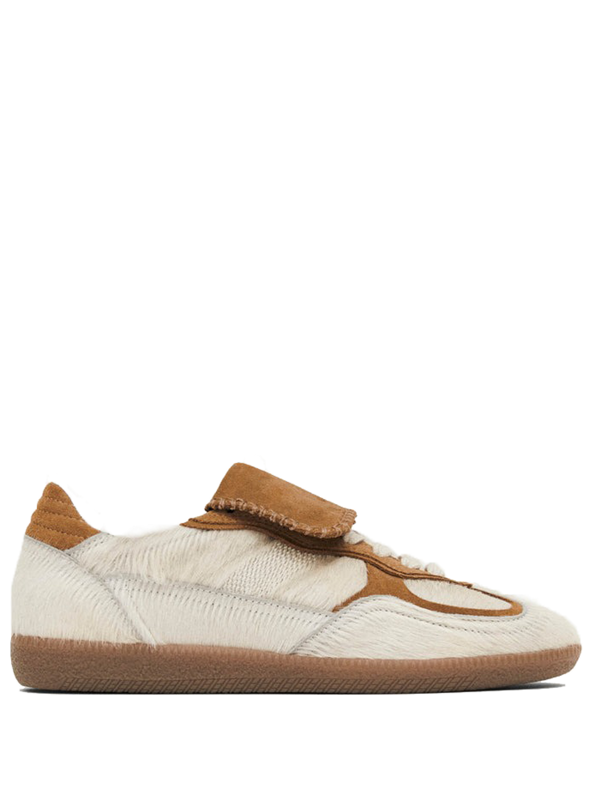 Snekaers crema e marroni TB 490 di Alohas in suede con punta tonda, chiusura frontale con lacci, design a inserti e suola in gomma.