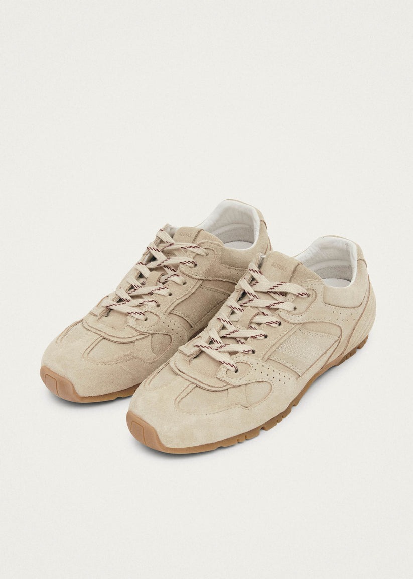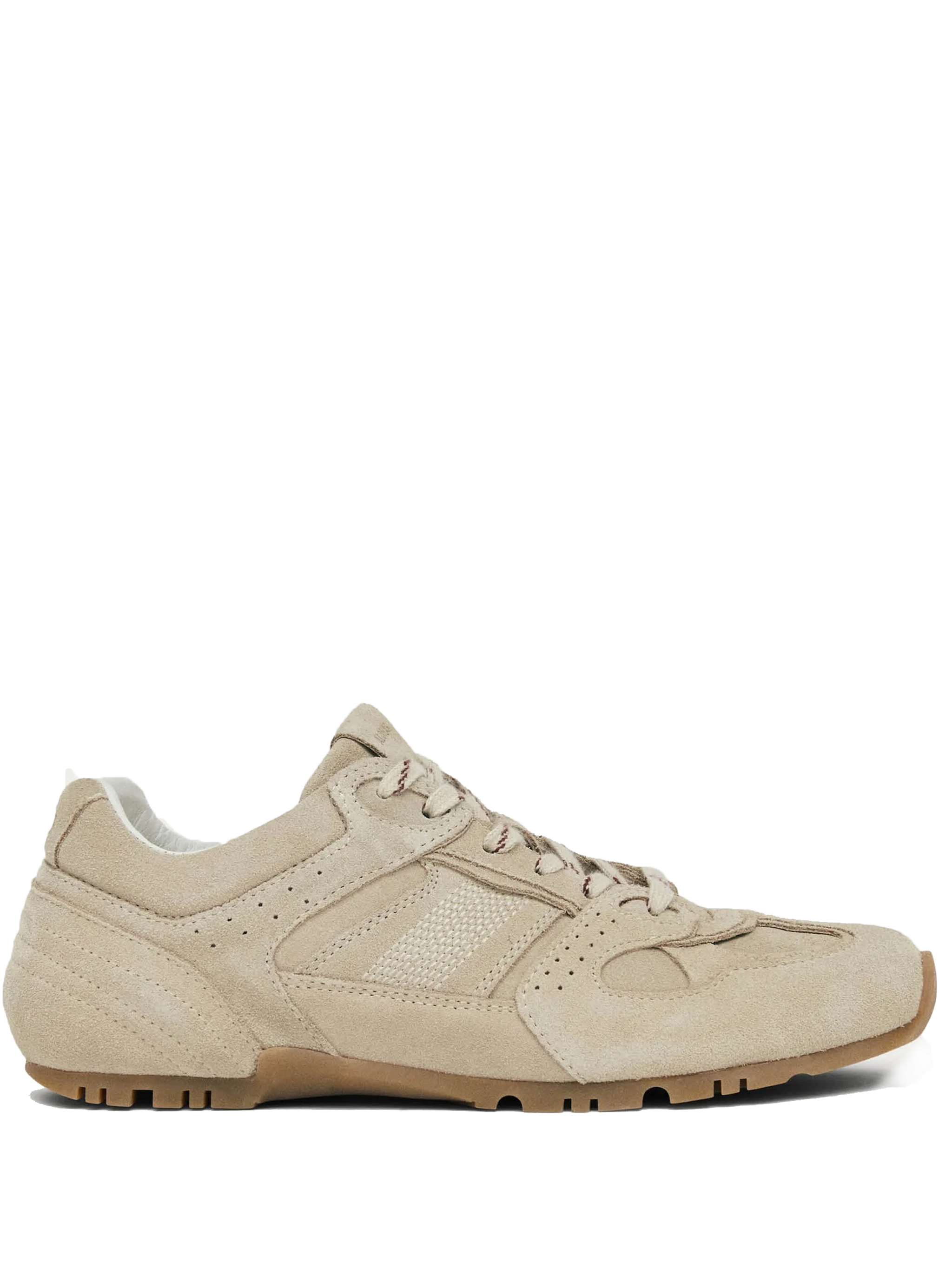 Snekaers crema TB 56 di Alohas in suede con punta tonda, chiusura frontale con lacci, design a inserti e suola in gomma.