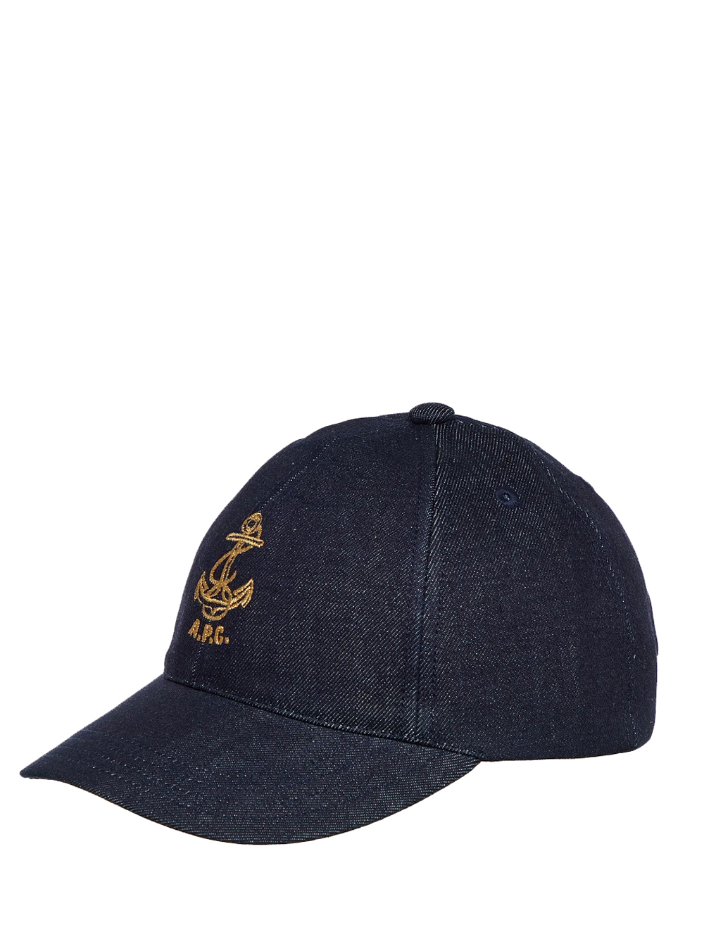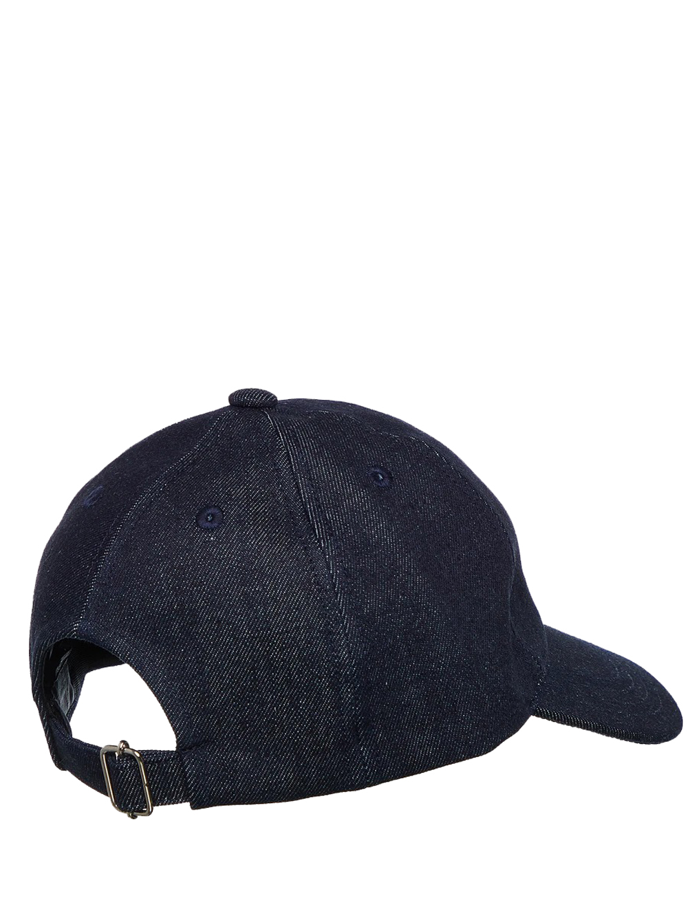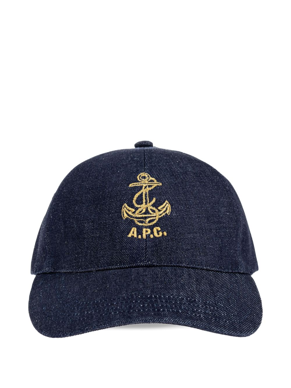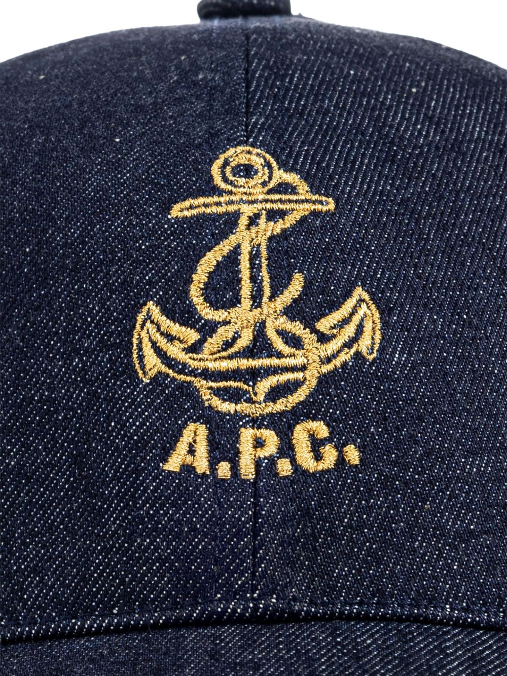 Cappello indigo Charlie Ancre di A.P.C. in cotoner con fascia con fibbia posteriore regolabile, design a sei inserti, stampa con logo sul davanti e tesa curva.