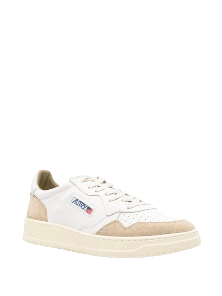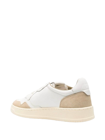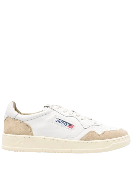 Sneakers bianche e beige chiaro Medalist Low Aulm GS44 di Autry in pelle con punta tonda, design traforato, chiusura con lacci, etichetta con logo, dettaglio nero e suola in gomma.