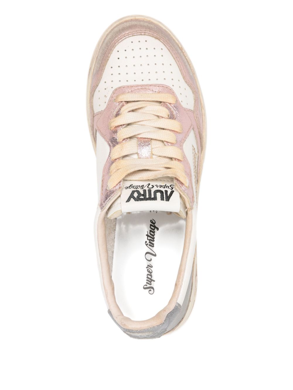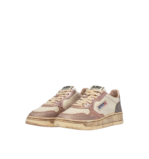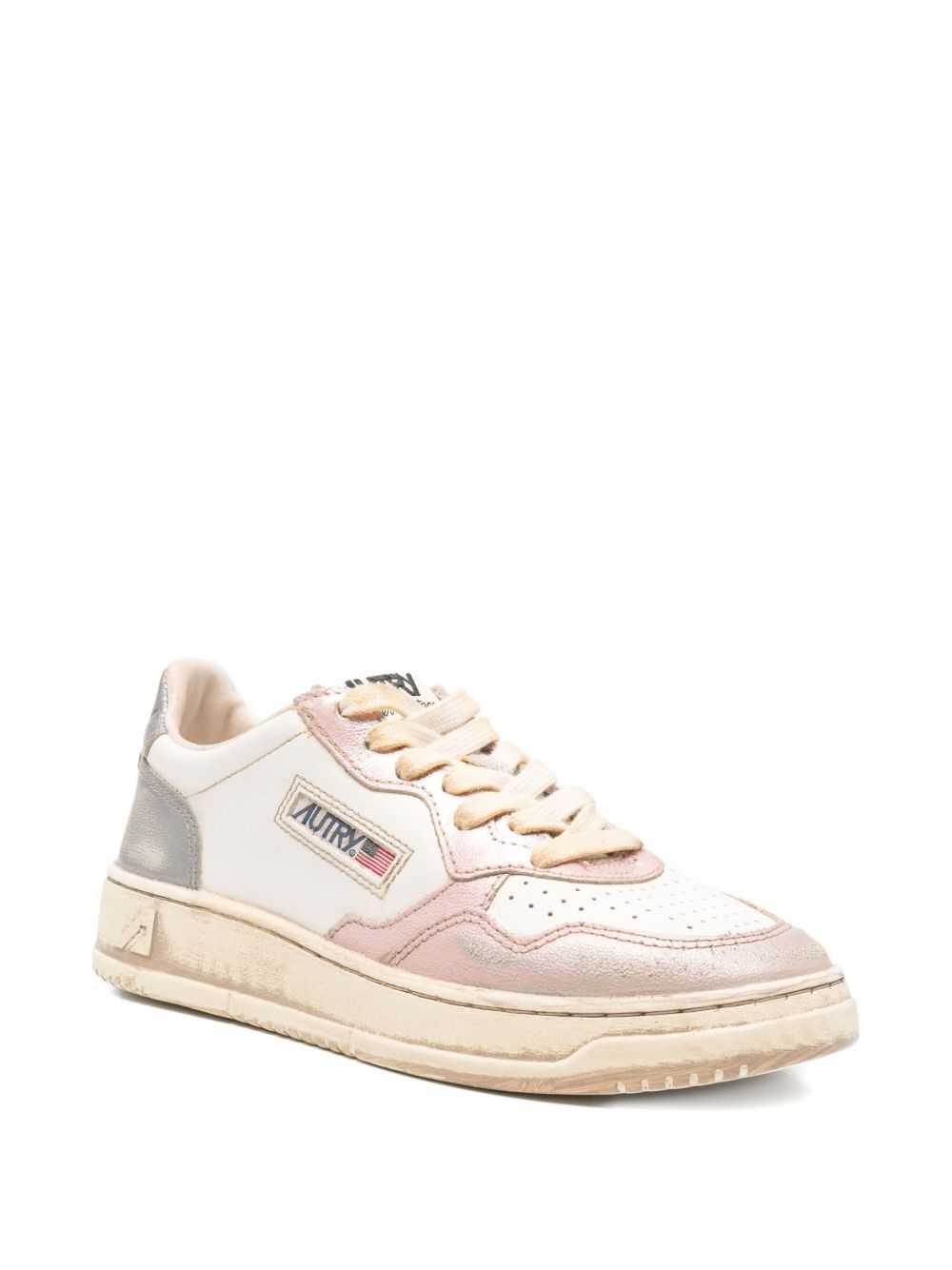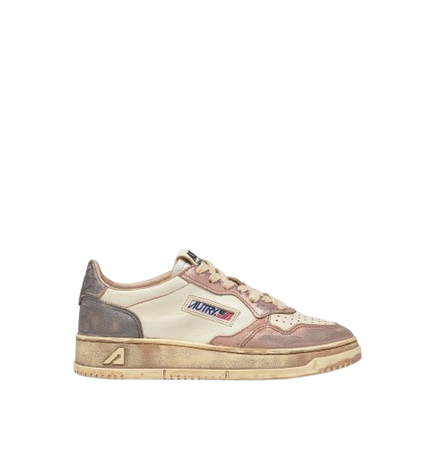 Sneakers bianche e rosa Medalist Low Super Vintage Avlm MT06 di Autry in pelle con punta tonda, chiusura frontale con lacci, logo laterale, dettaglio sul tallone, effetto vintage e suola piatta in gomma.