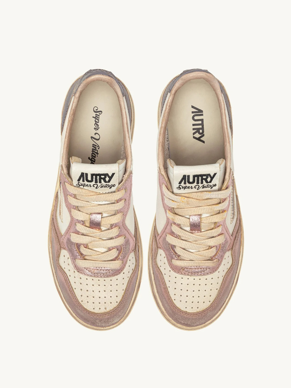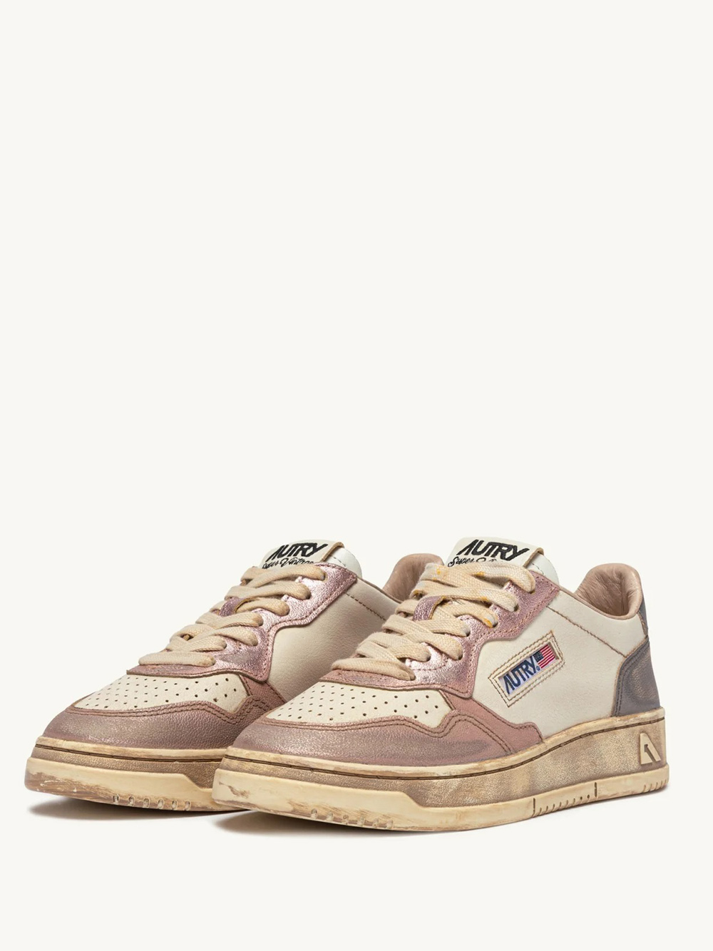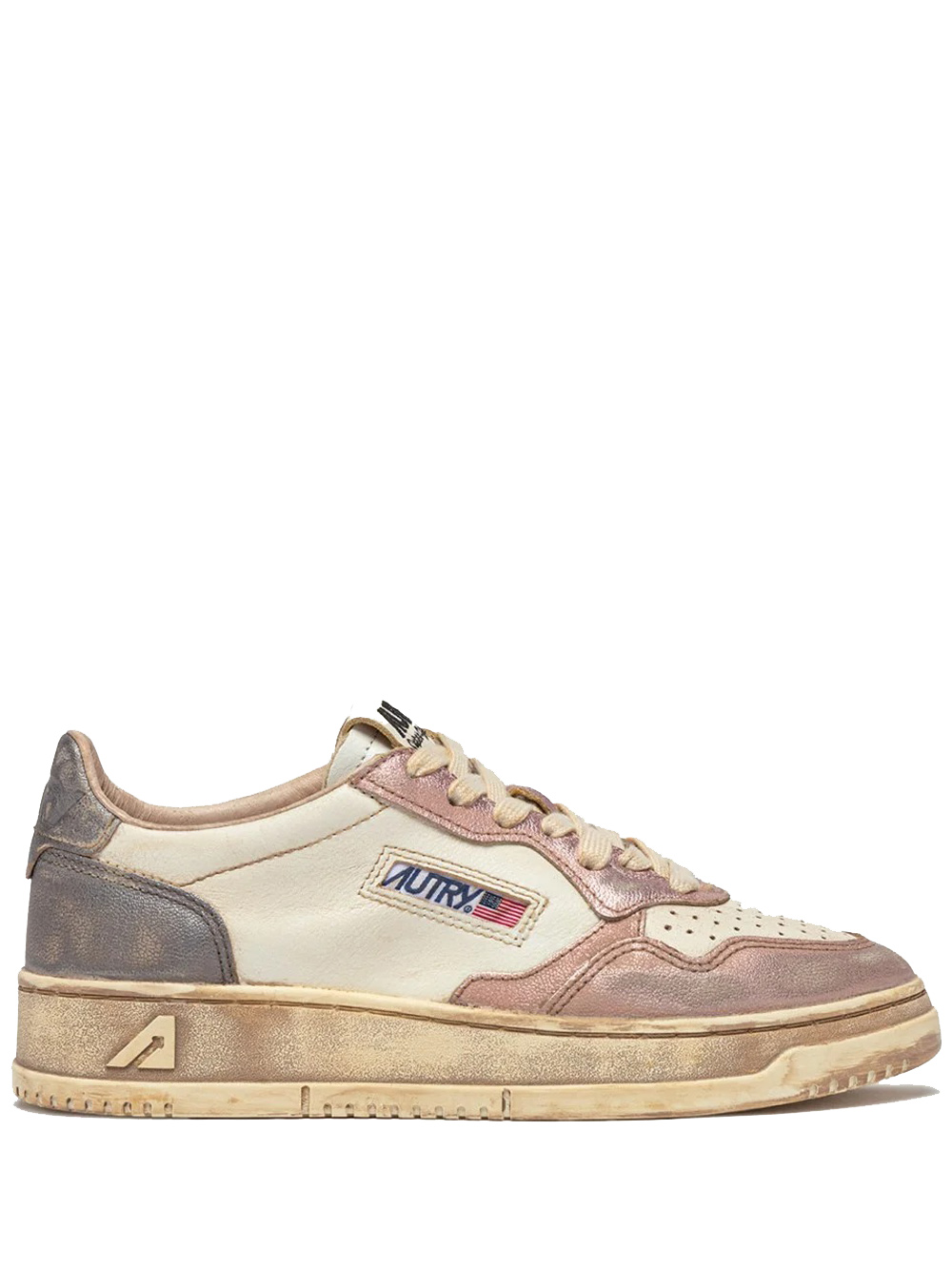 Sneakers bianche e rosa Medalist Low Super Vintage Avlm MT06 di Autry in pelle con punta tonda, chiusura frontale con lacci, logo laterale, dettaglio sul tallone, effetto vintage e suola piatta in gomma.