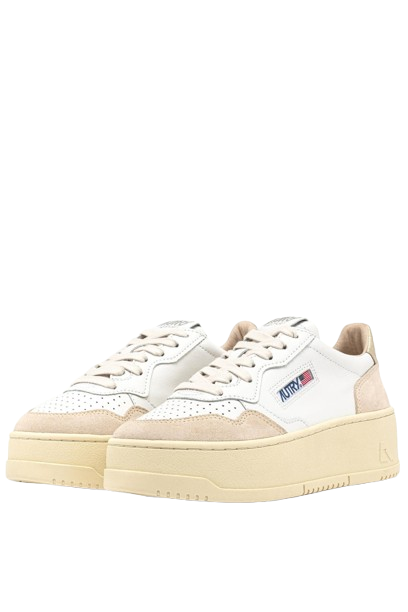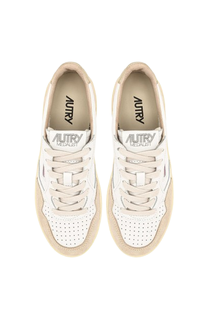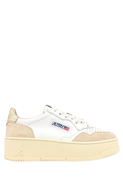Sneakers bianche, oro e beige Medalist PTL WLS01 di Autry in pelle con punta tonda, design traforato, etichetta con logo su un lato, chiusura con lacci, contrafforte a contrasto e suola alta in gomma.