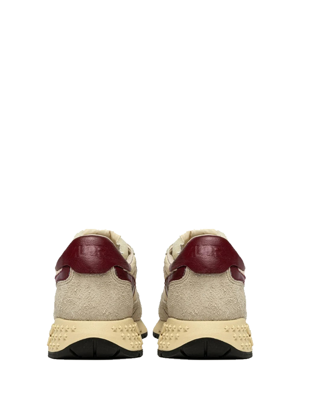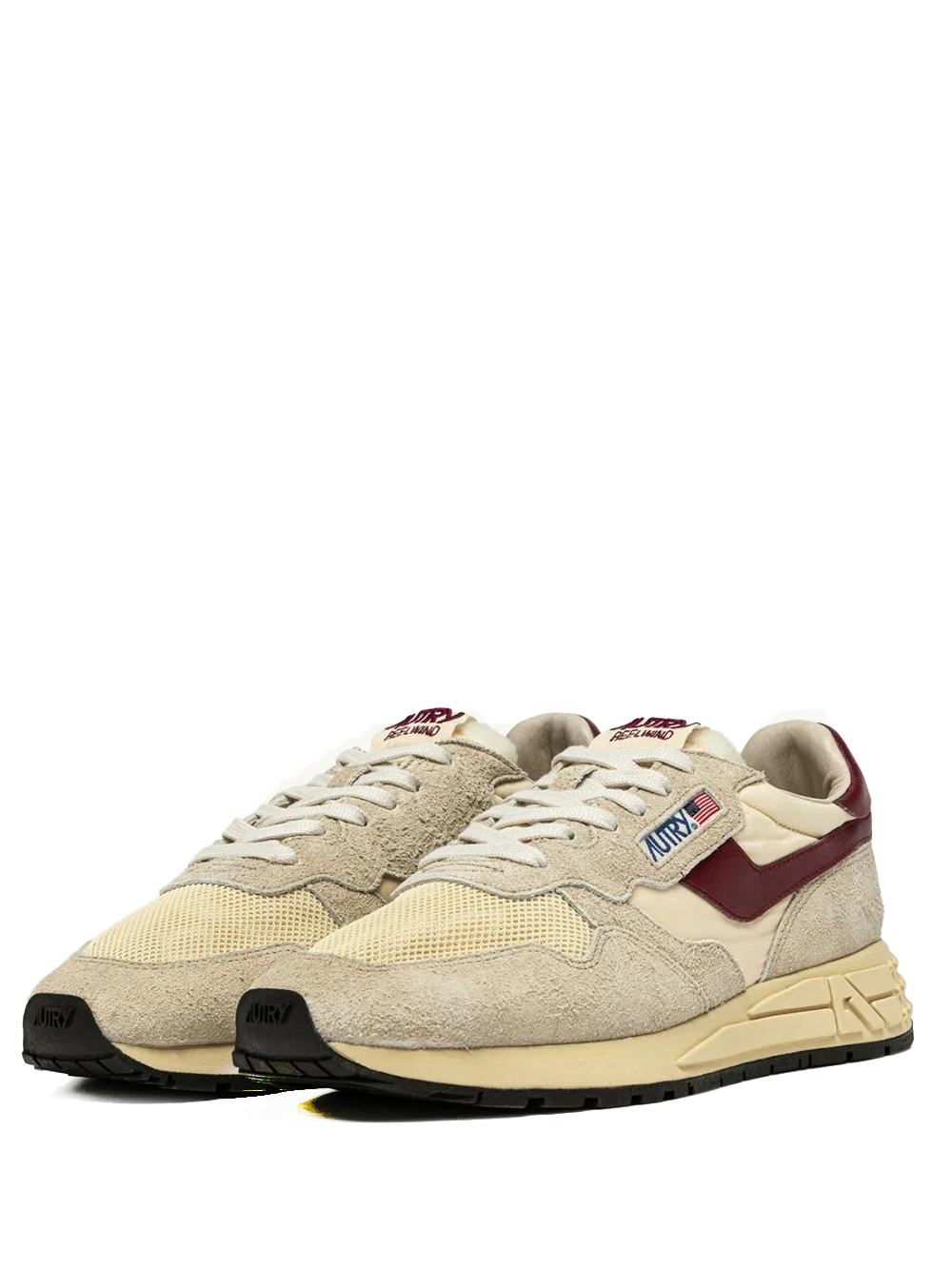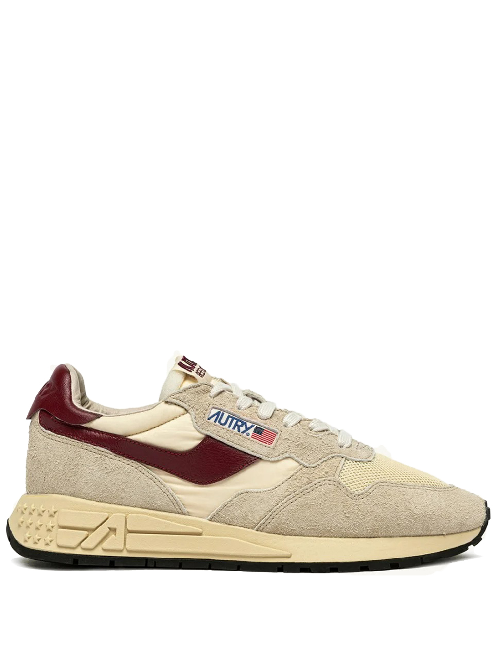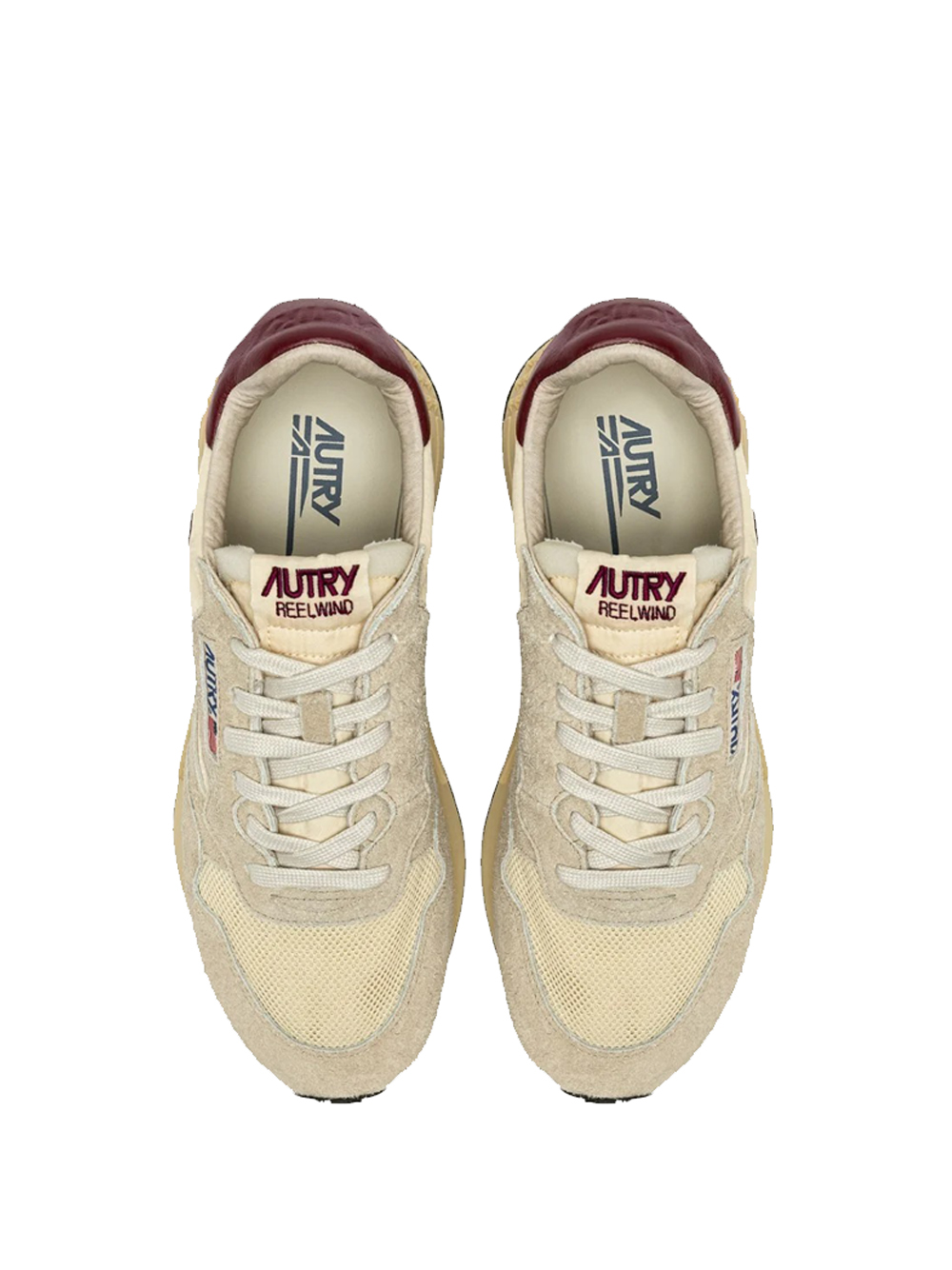 Sneakers ecru e borgogna Reelwind Low WWLM UT25 di Autry in pelle con punta a mandorla, chiusura con lacci, inserti in pelle scamosciata, applicazione laterale con logo e suola in gomma.