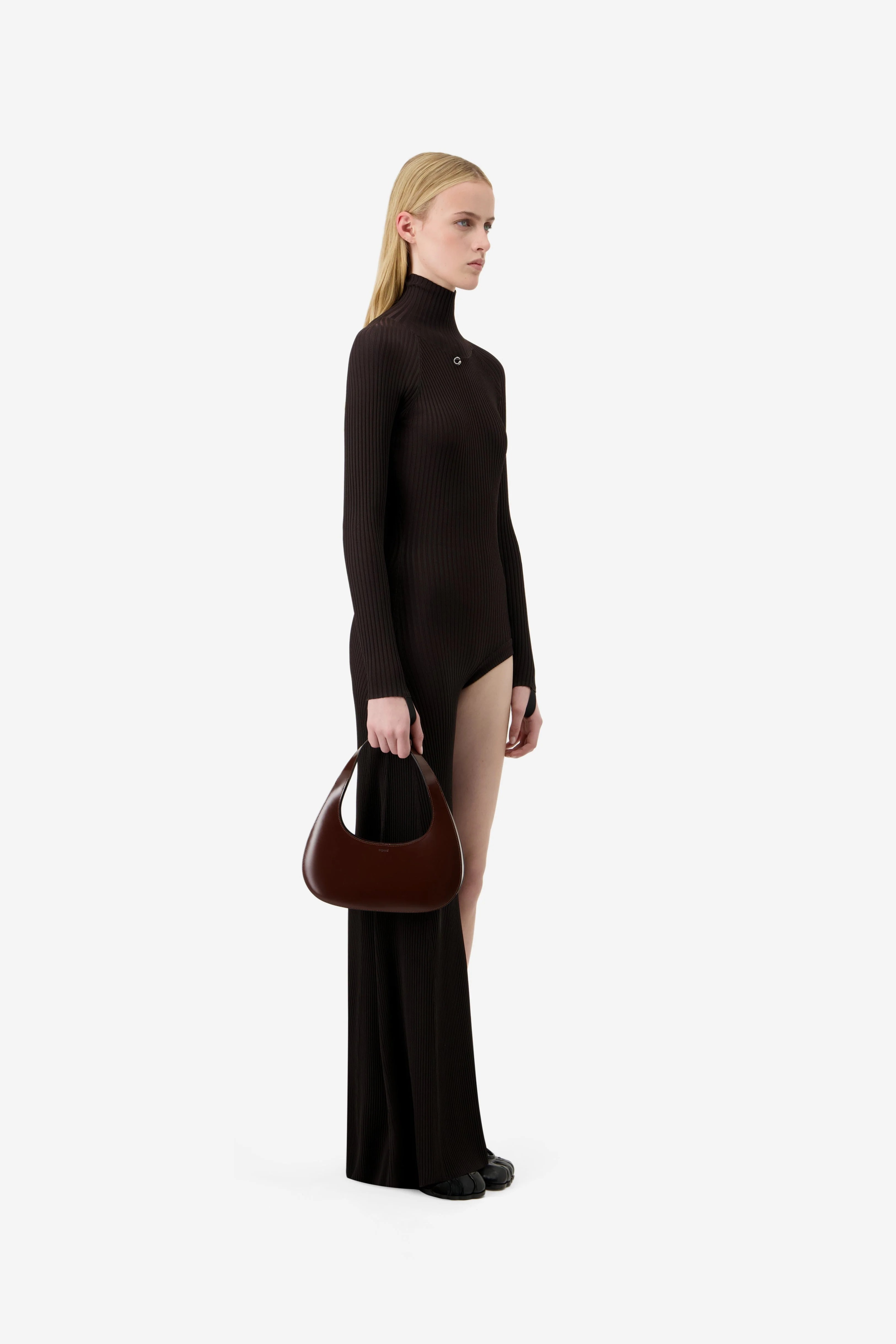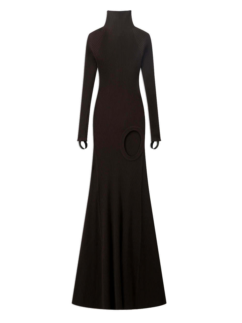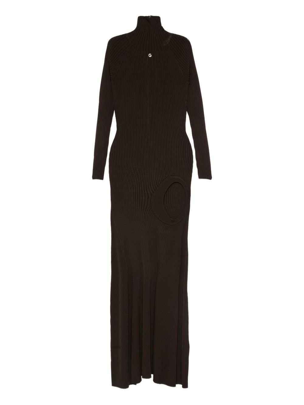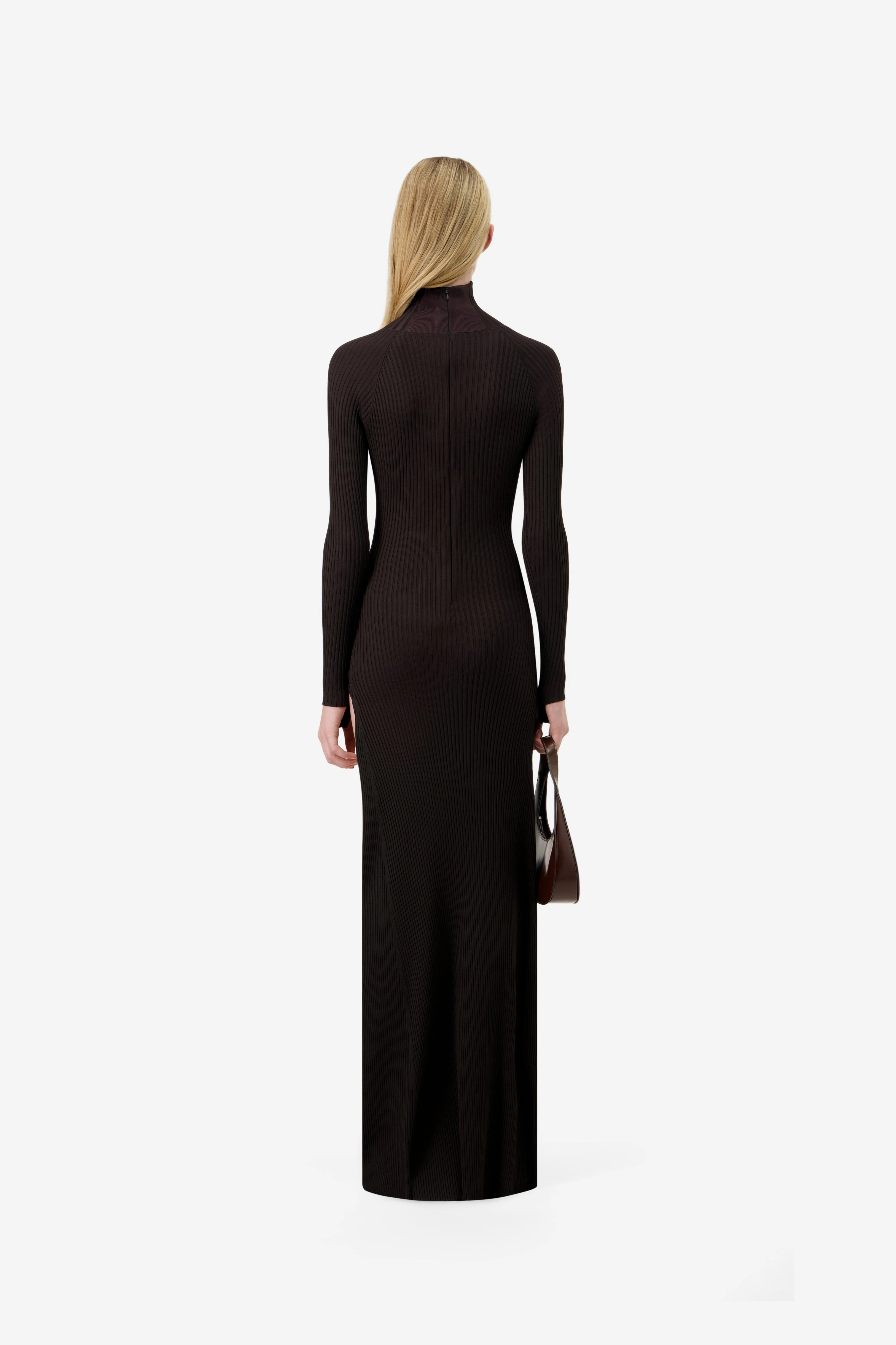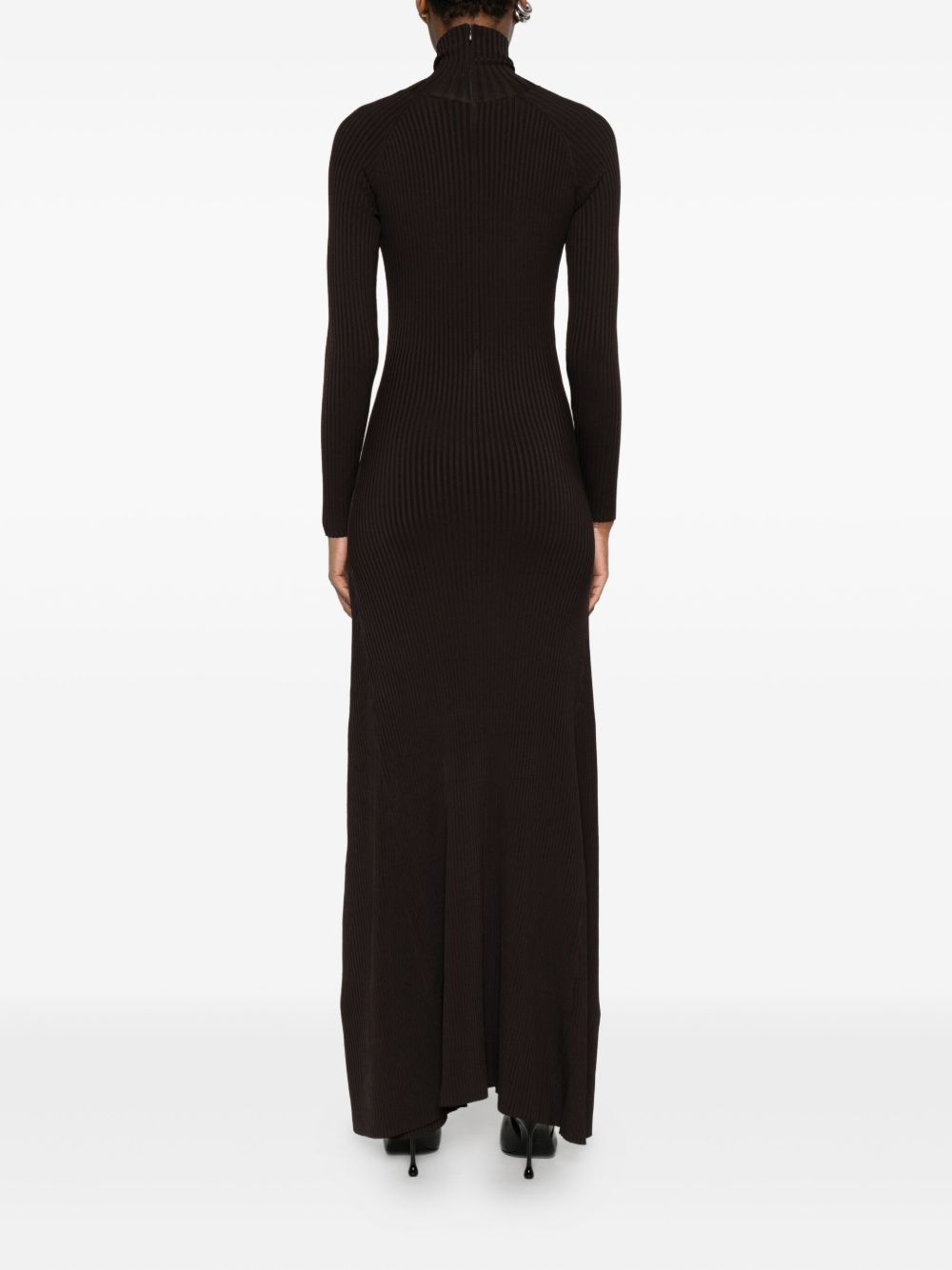 Abito lungo marrone Leg Cut-Out di Coperni in viscosa con collo alto, maniche lunghe, dettaglio cut-out sulla gamba, trama a coste e orlo dritto.