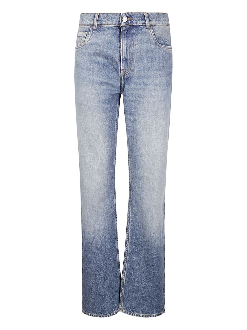 Jeans blu Denim Boyfriend di Coperni in cotone con lavaggio sfumato, cintura in pelle, cinque tasche e passanti.