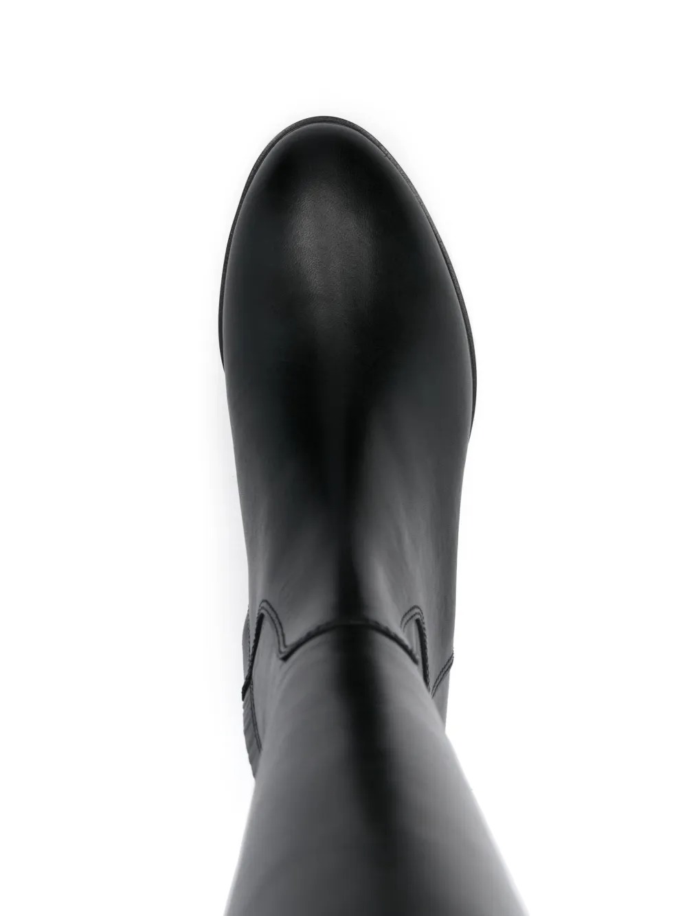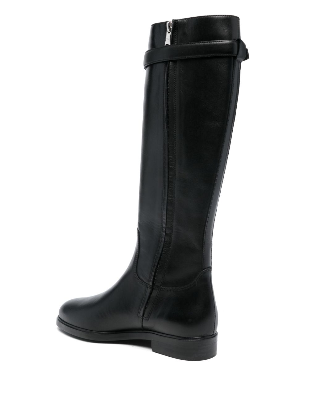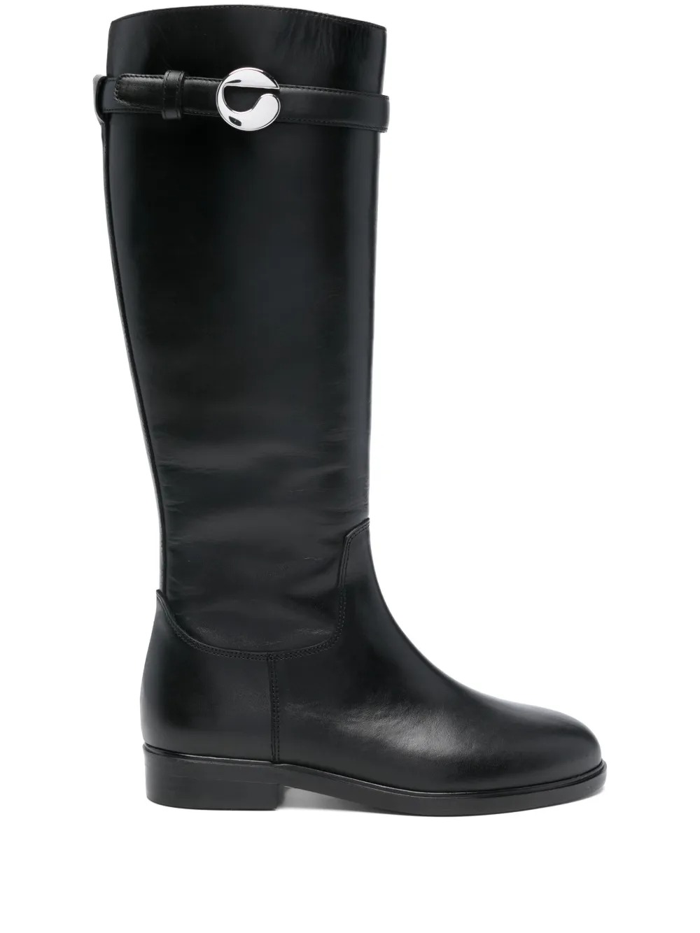 Stivali neri Cavalier Flat di Coperni in pelle con chiusura laterale con zip nascosta, tacco basso lamellato, lunghezza al ginocchio, fibbia Coperni laterale, dettaglio con cinghia laterale, punta smussata, soletta in pelle con logo e suola esterna in pelle.