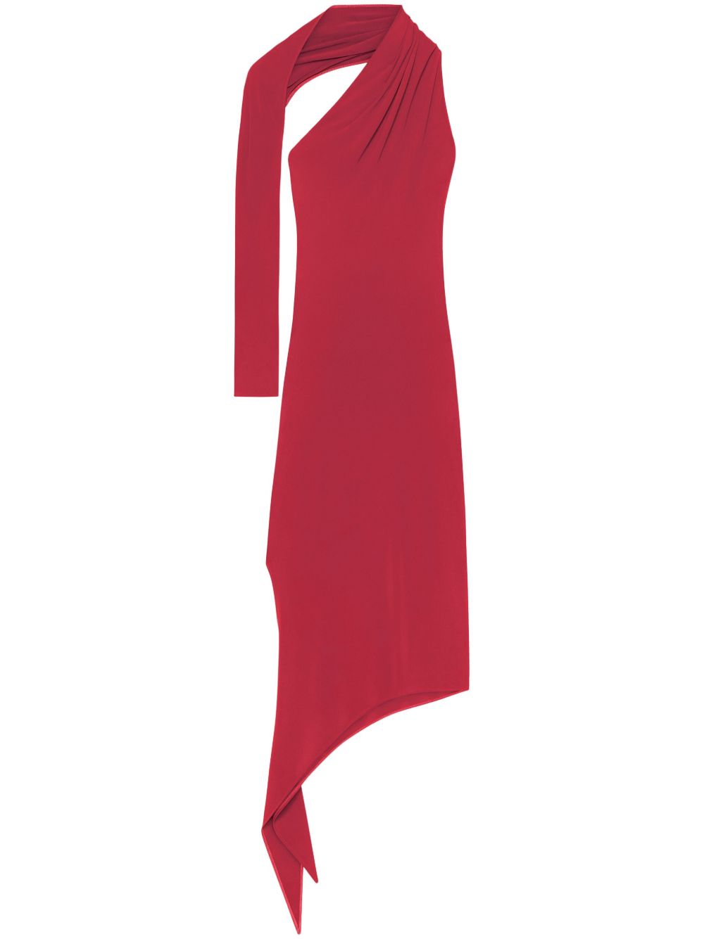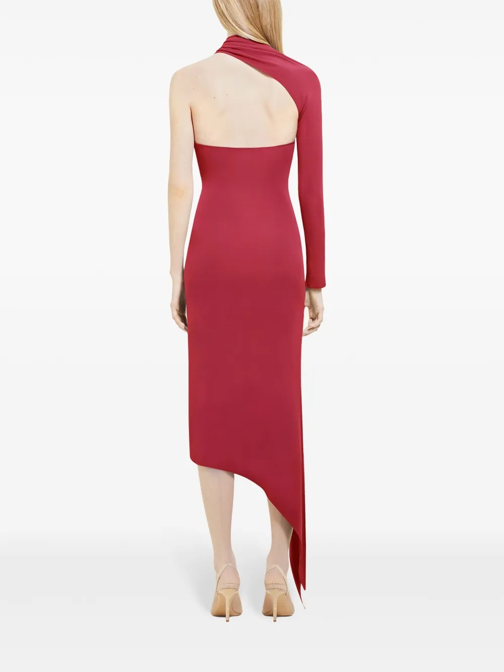 Abito lungo granata Slash Crepe di Courrèges in viscosa con trama effetto crêpe, design elasticizzato, scollo asimmetrico, dettaglio cut-out, manica lunga singola, apertura sul retro e orlo asimmetrico.