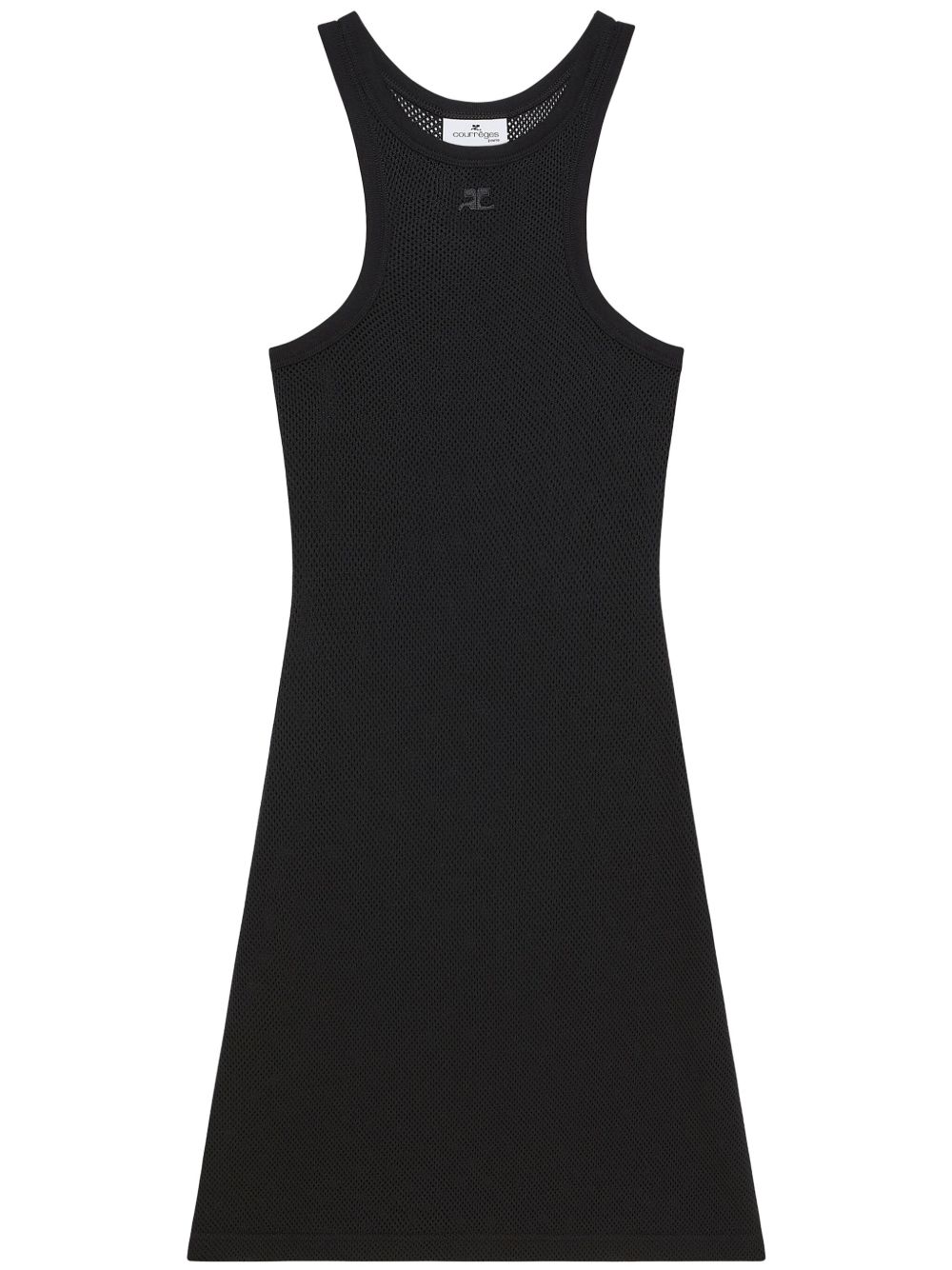Mini abito nero Scuba Mesh di Courrèges in cotone con scollo olimpionico, ricamo con logo frontale, design a coste e orlo dritto.