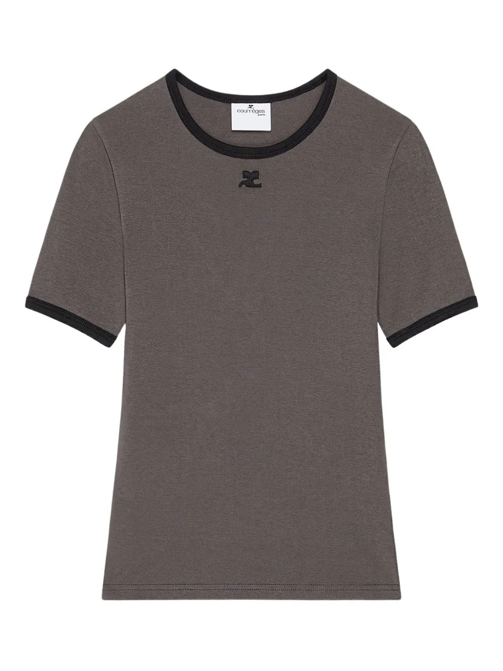 T-shirt grigia Signature Contrast di Courrèges in cotone, con applicazione frontale con logo, bordo a contrasto, scollo rotondo e orlo dritto.