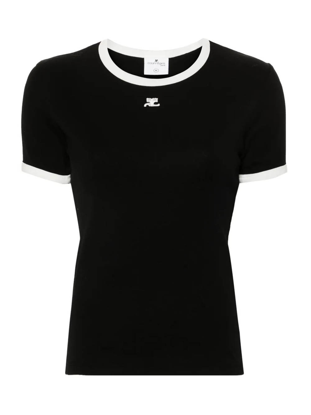 T-shirt nera e bianca Signature Contrast di Courrèges in cotone, con applicazione frontale con logo, bordo a contrasto, scollo rotondo e orlo dritto