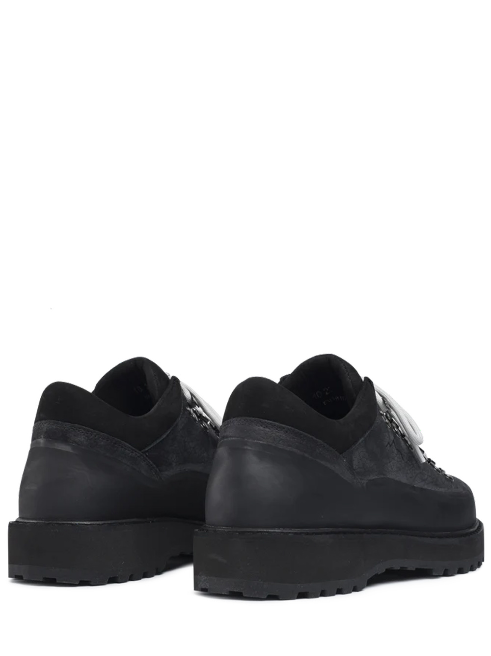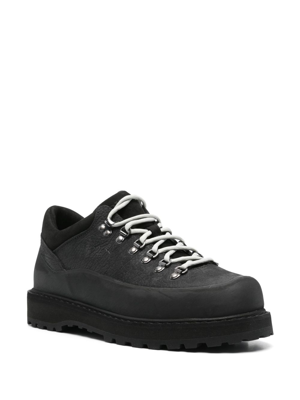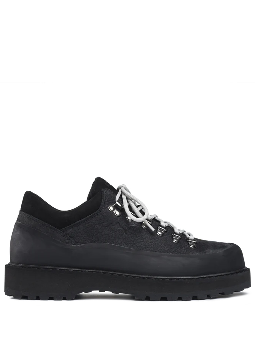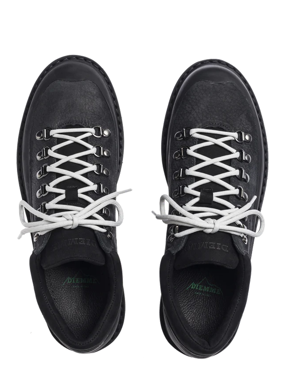 Stivaletti neri Cornaro Gomma di Diemme in pelle con trama martellata, chiusura frontale con lacci, design a inserti, linguetta con logo inciso, logo laterale inciso, punta in gomma, punta tonda, soletta in pelle con logo e suola in gomma antiscivolo.
