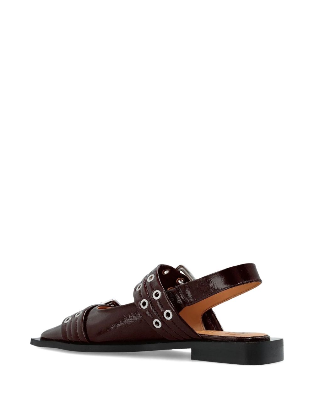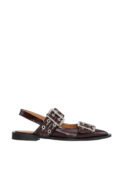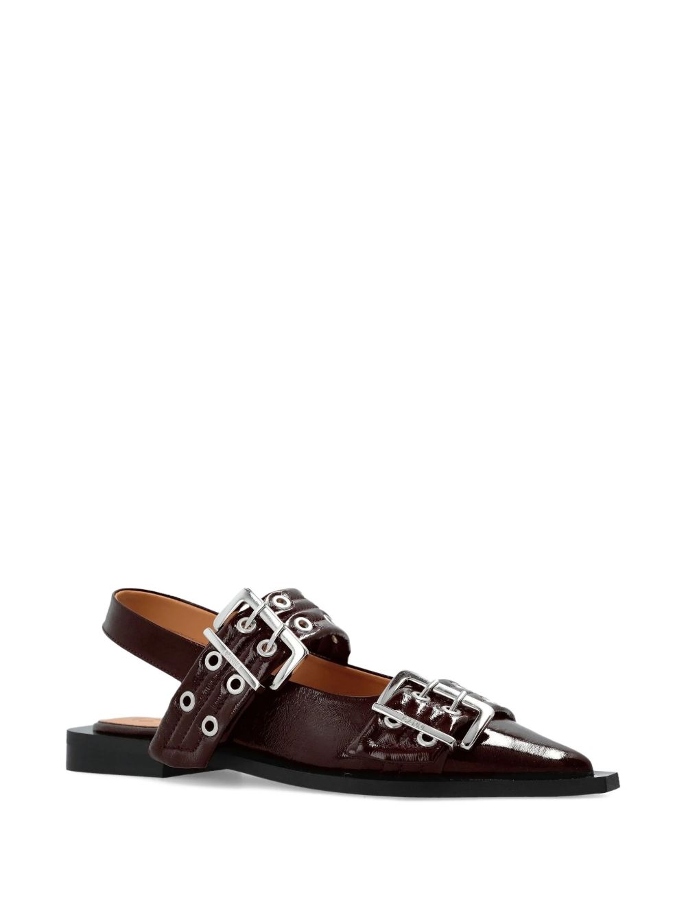 Ballerine borgogna Feminine Buckle di Ganni in poliestere con design a punta, rifinitura lucida, chiusura con doppia fibia, cinturino posteriore e suola piatta.