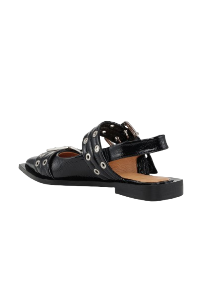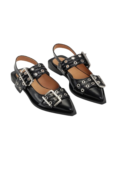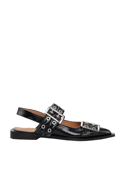 Ballerine nere Feminine Buckle di Ganni in poliestere con design a punta, rifinitura lucida, chiusura con doppia fibia, cinturino posteriore e suola piatta.