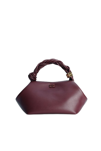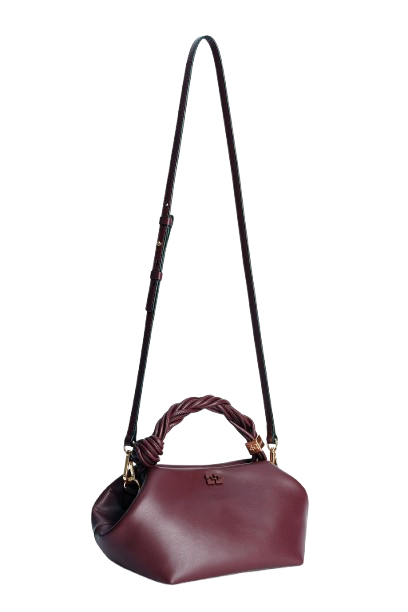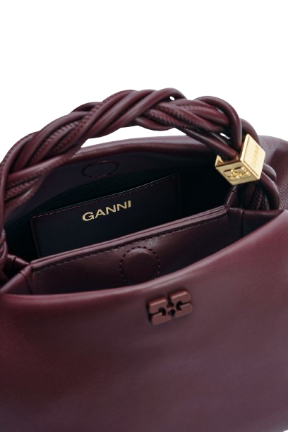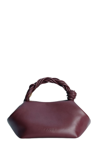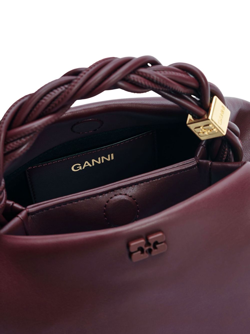Borsa borgogna Bou Small di Ganni in pelle con manico intrecciato, dettagli color oro, placca con logo, chiusura magnetica, tracolla regolabile e rimovibile.