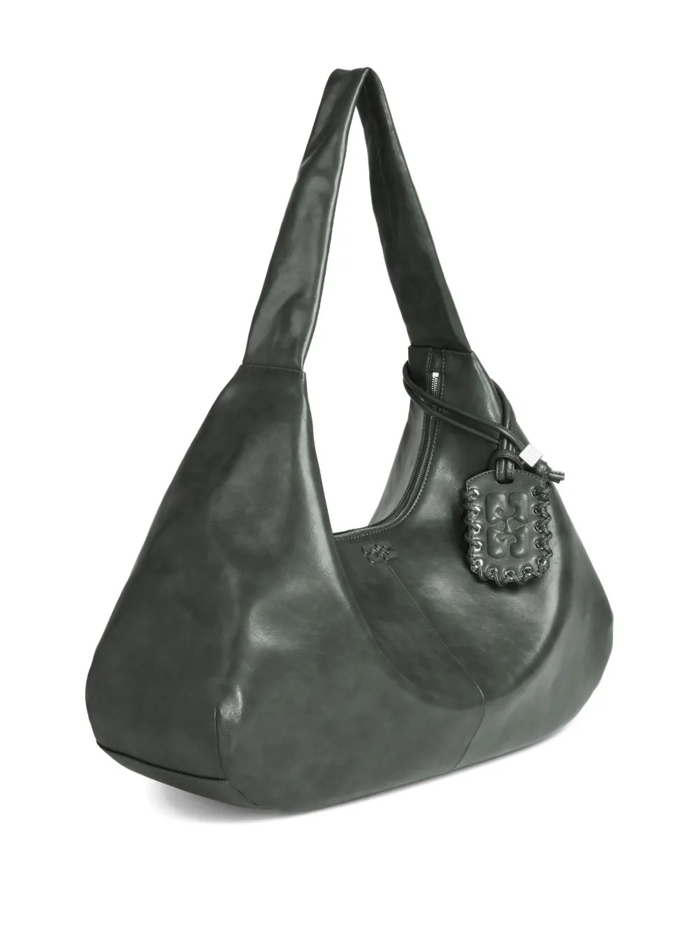 Borsa grigia XXL Hobo di Ganni in pelle con design morbido, portachiavi con logo rimovibile, dettaglio con cuciture curve e due tracolle.
